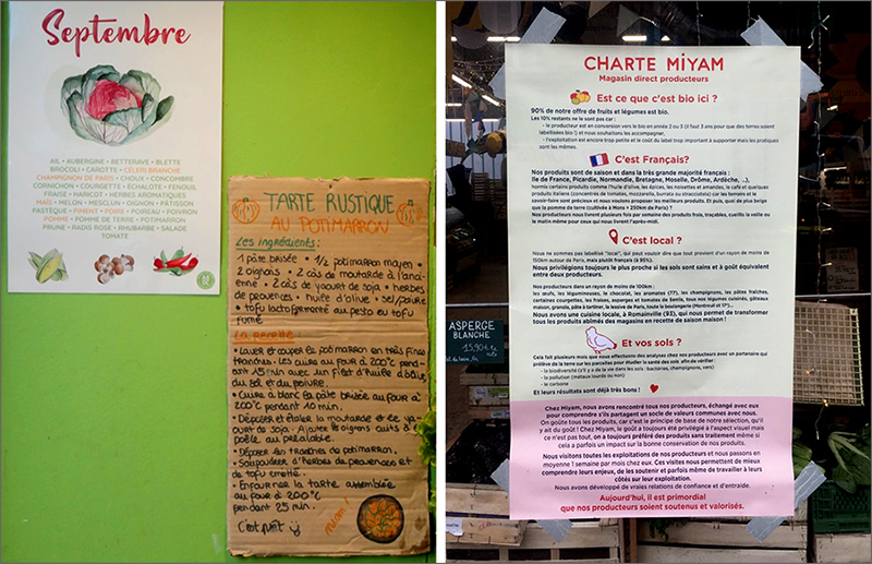 Pour les commerçants rencontrés, un primeur engagé est avant tout un médiateur entre les producteurs et les consommateurs. Alors que les primeurs conventionnels placent au cœur de leur mission la satisfaction de la demande des clients, ceux alternatifs insistent sur leur volonté de les sensibiliser aux contraintes inhérentes aux périmètres d’approvisionnement plus restreints dans l’espace et le temps : « c’est aussi de dire qu’on peut avoir des choses près de chez nous qui sont bien. […] C’est une curiosité qui est ouverte par ce qu’on a cette contrainte » (entretien avec Philippe, exploitant de deux points de vente, décembre 2020). Cette valorisation joue un rôle important dans la stratégie commerciale et fait l’objet d’une communication accrue dans et devant les boutiques (figure 1).