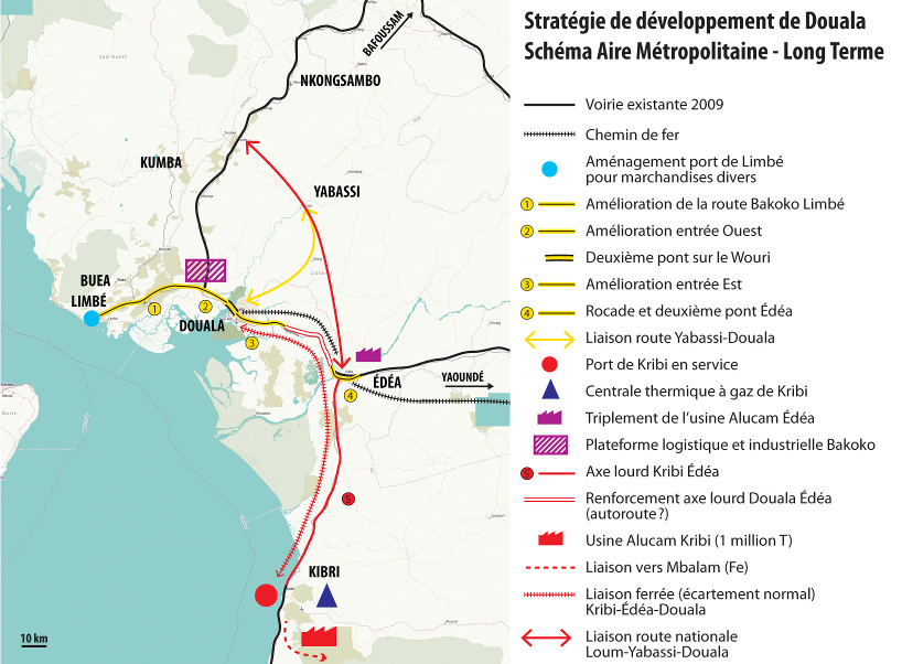 La géographie des activités informelles et spontanées révèle une énergie à l’œuvre dans la ville, qui est celle des nouveaux arrivants, inventant leur emploi et s’immisçant dans les espaces d’opportunité du tissu urbain (Simone 2006). Cette énergie travaille le corps de Douala et entre en contradiction avec la forme urbaine héritée de la planification fonctionnaliste des années 1960, pour partie reconduite par les plans d’urbanisme successifs. Celle-ci, en effet, organise l’ensemble du système urbain à partir de la fonction portuaire. L’axe majeur traversant la ville est ainsi exclusivement dédié à la logistique et à l’industrie. Autrefois situées en limite de ville, ces emprises infrastructurelles de grande dimension sont désormais au cœur de l’agglomération. Elles forment un espace confisqué et interdit autour duquel une constellation d’activités spontanées s’implantent. Les nouvelles polarités de l’informel peuvent ainsi apparaître comme une forme de contestation d’un ordre urbain hérité et toujours confirmé dans la planification urbaine.