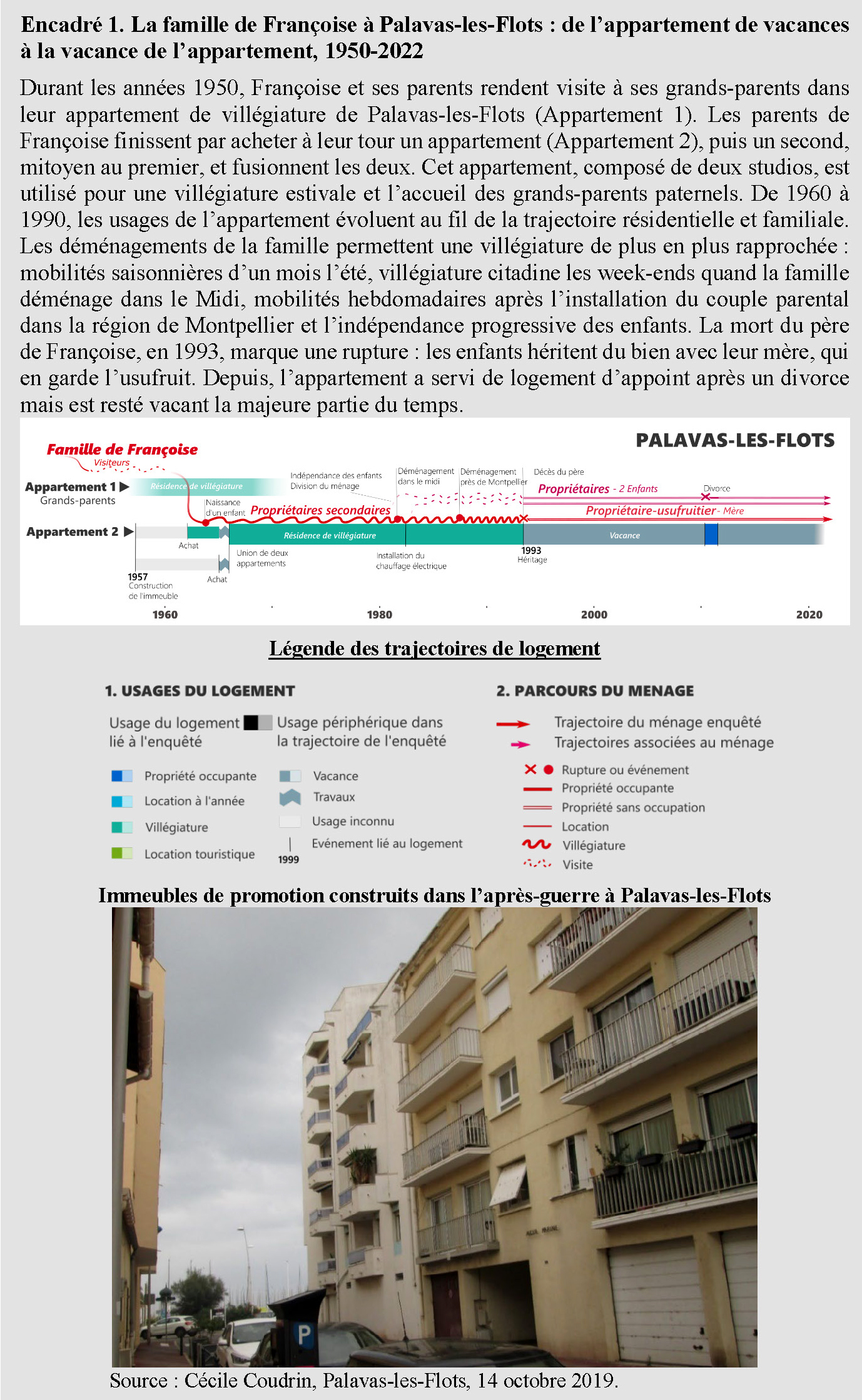 La première trajectoire est celle du logement familial intergénérationnel de villégiature de la famille de Françoise à Palavas-les-Flots (Encadré 1). Palavas-les-Flots est un village de pêcheurs devenu station balnéaire et un lieu privilégié de la villégiature et de l’excursionnisme montpelliérain depuis la fin du XIXe siècle. Cette trajectoire est emblématique du potentiel hybride de la résidence de villégiature, entre logement touristique et résidentiel, qui endosse un rôle de creuset de la mémoire familiale (Ortar 2012). L’intensité d’usage de cette villégiature familiale et intergénérationnelle a évolué sur une période de quarante ans : l’appartement est passé d’une fréquentation de période saisonnière, à mensuelle, puis quasiment hebdomadaire, au fur et à mesure des déménagements de la famille qui s’est rapprochée du littoral, puis a délaissé l’appartement après un décès.