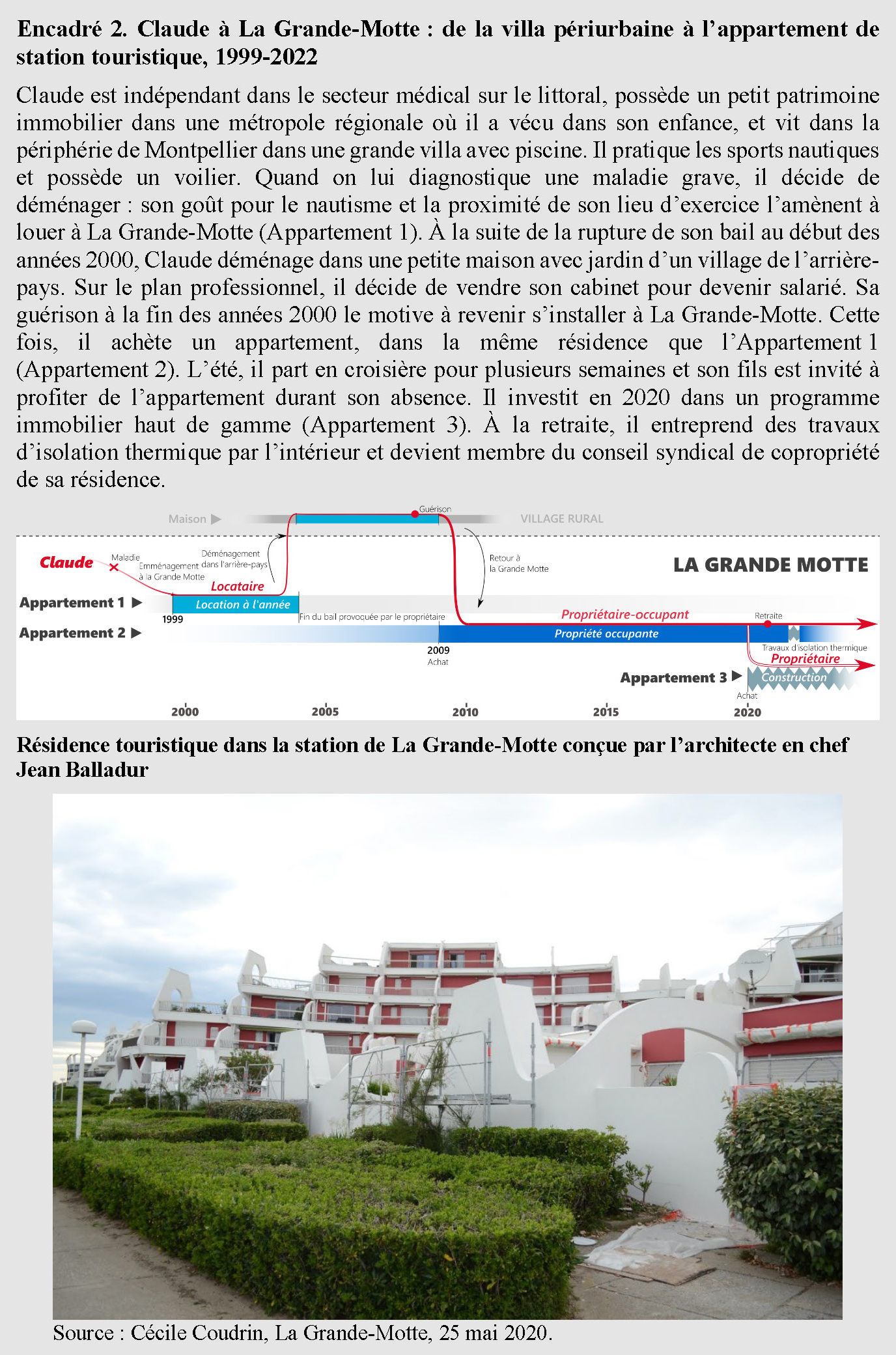 La deuxième trajectoire est celle du logement de l’habitant-touriste de Claude à La Grande-Motte (Encadré 2). L’habitant-touriste se définit comme un acteur « susceptible de devenir alternativement touriste et habitant, [selon une] permanente imbrication entre deux modes de vie qui ne cessent de se rapprocher jusqu’à parfois se confondre » (Crozat et Alves 2018). La trajectoire rend compte de l’ancrage progressif de Claude à La Grande-Motte, « ville-station » emblématique de la Mission Racine [4] (Rieucau 2000). Ses choix résidentiels sont marqués par des allers-retours entre le littoral et le rétro-littoral, au gré de sa santé ou de l’évolution de sa vie professionnelle. Il s’installe finalement au bord de la mer à l’heure de la retraite.