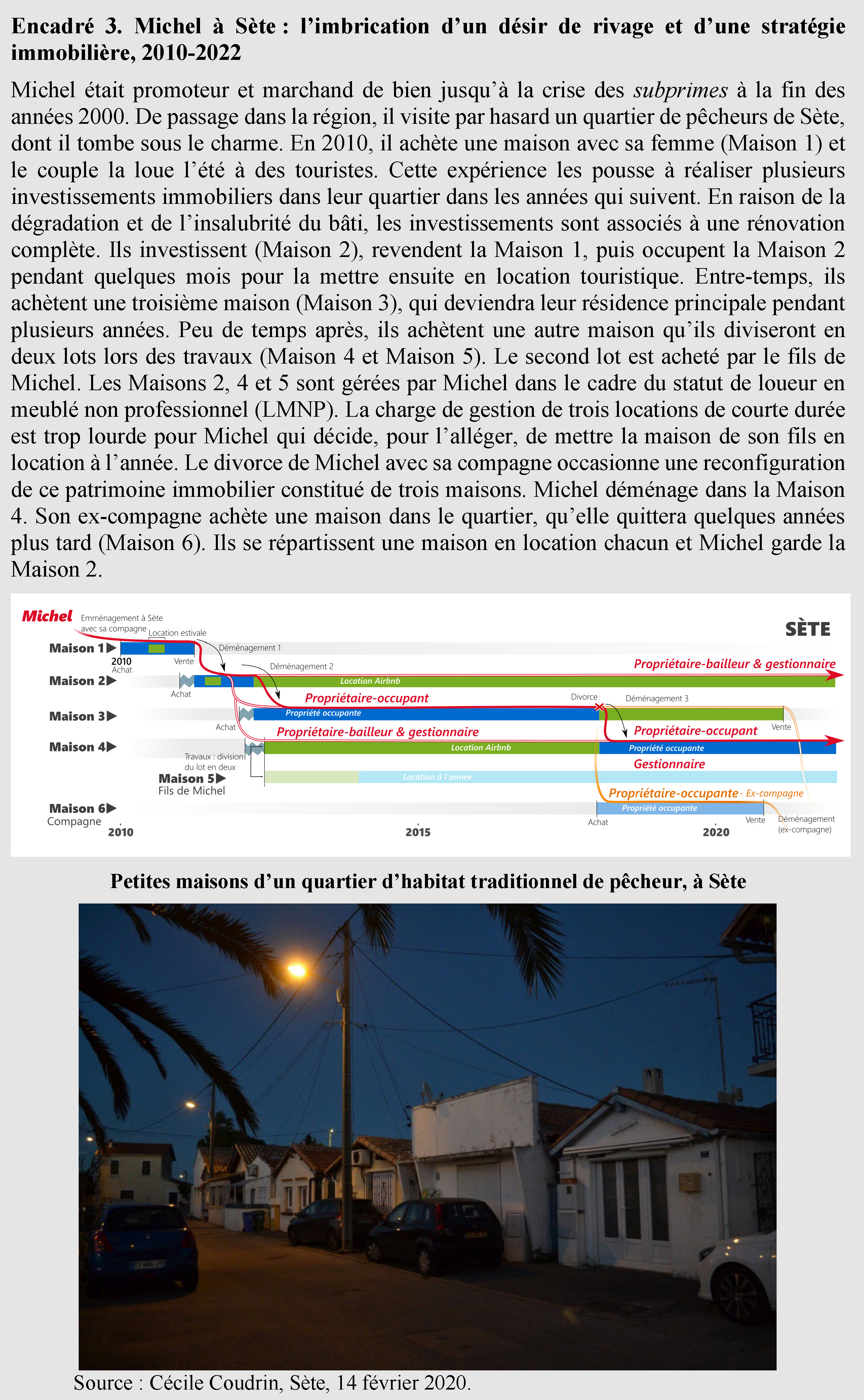 La troisième trajectoire est celle du logement coup de cœur du professionnel de la requalification immobilière (Encadré 3). Ville portuaire royale traversée de canaux reliant la mer et l’étang de Thau, centralité du tourisme balnéaire de la fin du XIXe siècle, Sète fait aujourd’hui l’objet d’un intérêt médiatique et touristique croissant (festivals estivaux, production de séries télévisées). Cette trajectoire montre l’articulation entre un parcours résidentiel et une stratégie d’investissement immobilier chez un ancien promoteur tombé sous le charme d’un quartier de pêcheurs. Les investissements de Michel suivent une volonté d’ancrage dans un quartier de bord de mer où il a choisi d’habiter et de travailler.