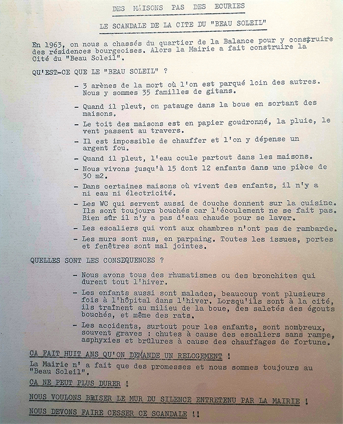 Cette vision folklorisante se traduit par les « normes simplifiées [11] » à l’extrême qui caractérisent la cité lorsqu’elle émerge de terre en 1964. À l’excentration et à la promiscuité forcée de familles logées jusqu’alors de façon indépendante dans différentes rues de la Balance s’adjoint une hyper-précarité que le caractère « futuriste [12] » de l’ensemble ne masque pas. Alors que la cité accueille plus des deux tiers de la population des gitans avignonnais que côtoie l’Association vauclusienne des Amis des gens de la route, des bénévoles doivent parer aux manquements de la construction dont les toitures, par exemple, ne tiennent ni le vent ni la pluie [13]. Moins de quatre années plus tard, la cité est caractérisée de taudis [14] et voisine avec un second îlot d’habitations destiné à 80 familles de harkis, qui accusent elles aussi le désengagement de la municipalité. Car si la cité du Soleil est programmée par la ville d’Avignon, celle-ci s’en désengage : l’œuvre de Candilis, « surpeuplée [15] », tourne au bidonville, accueillant en 1970 quelque 400 personnes dans des « conditions sordides ». Un responsable religieux précise l’année suivante qu’« en résumé, les Gitans ont compris une fois encore combien ils étaient relégués [16] » et, quelques mois plus tard, dans un tract distribué en centre-ville, une association groupant des habitants de la cité témoigne du « Scandale de la cité du “beau Soleil’’ », décrite comme « 3 arènes de la mort où [ils sont] parqué[s] loin des autres [17] » (figure 4).