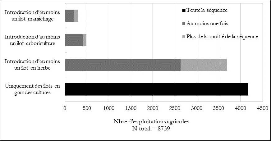 À ces évolutions parcellaires s’ajoutent des évolutions dans le choix des productions, que nous avons saisies en détectant l’introduction de cultures de diversification (maraîchage, arboriculture et herbe) au cours de la période (figure 2). Les exploitations dont le parcellaire est stable ou en croissance ont majoritairement déclaré l’introduction d’au moins une culture de diversification (au moins une fois ou durant plus de la moitié de la séquence). Cependant, il s’agit le plus souvent de l’introduction de prairies temporaires (30 %) ou de la déclaration de surfaces en herbe (12 %), et marginalement de productions en arboriculture (5 %) ou maraîchage (3,5 %).