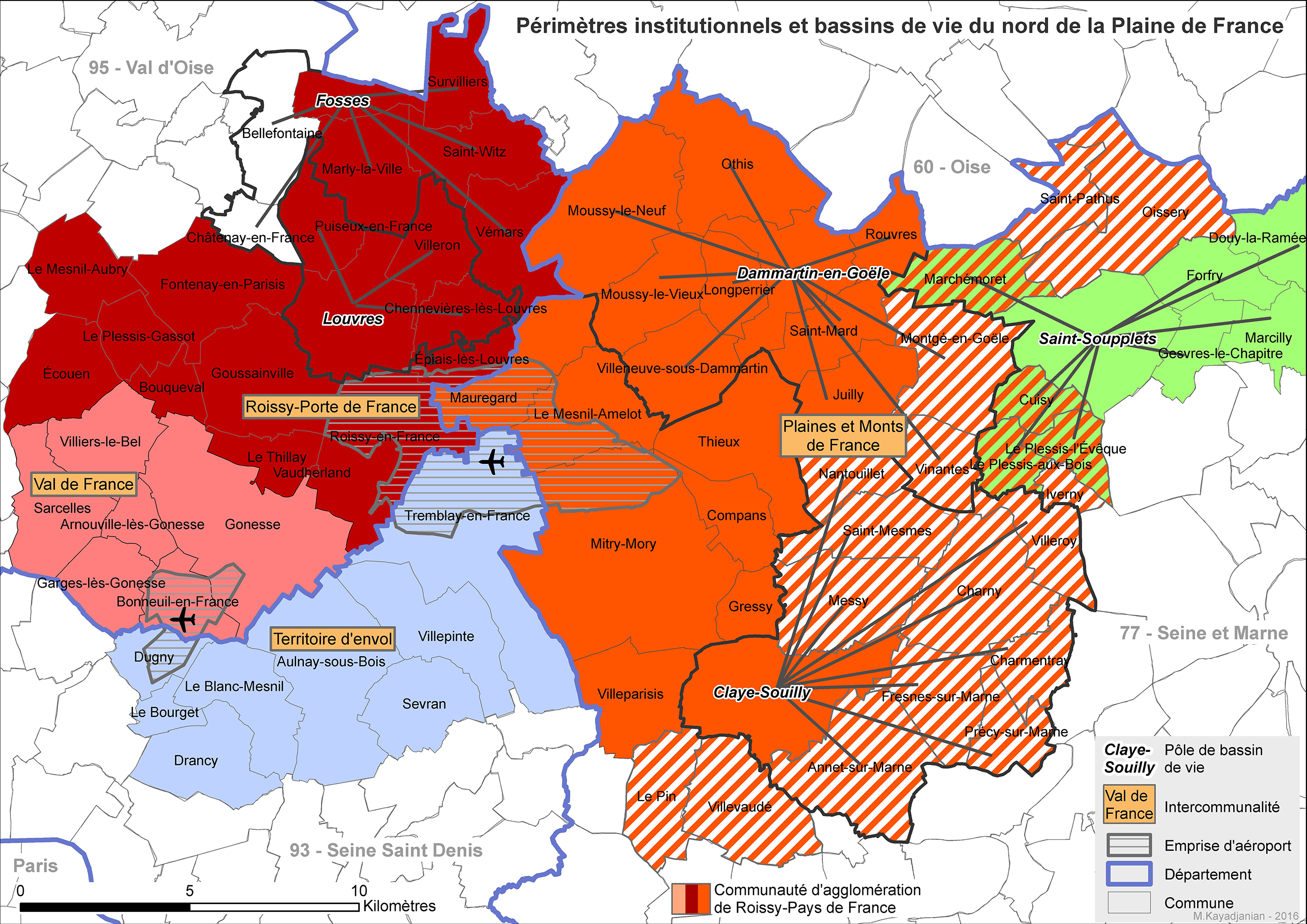 À titre d’exemple, le territoire nommé « Grand Roissy » par la Région, regroupant deux intercommunalités [11], fournit un exemple frappant du décalage entre l’approche institutionnelle et la réalité du terrain. Sur la carte de ce territoire (figure 4), on peut constater la présence des entités suivantes : un pôle d’activités aéronautiques interdit à l’habitat : Roissy ; trois bassins de vie en zone rurale : Fosses, Louvres et Dammartin-en-Goële ; deux bassins de main-d’œuvre générés par deux importants pôles urbains : Sarcelles et Aulnay-sous-Bois, et une ville dissociée : Gonesse.