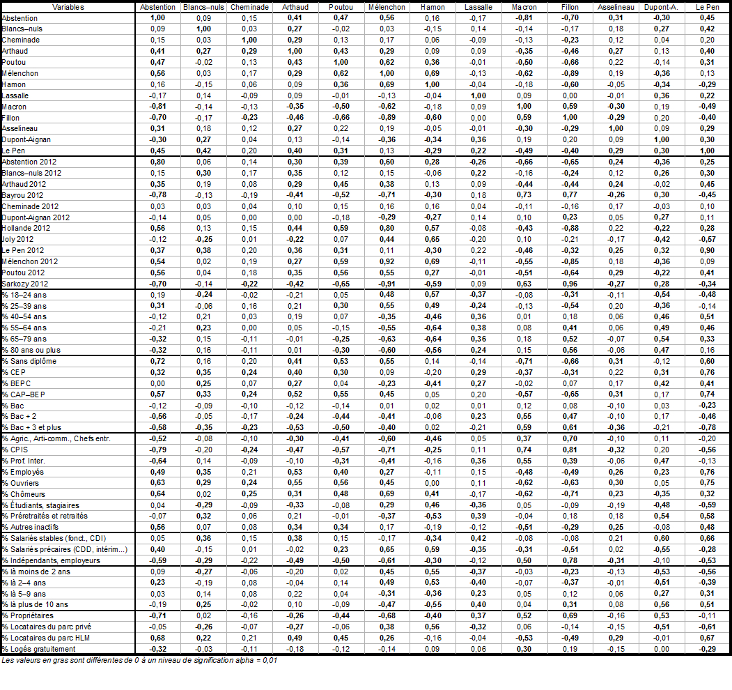 | Annexe 1. Quelques précisions méthodologiques Comme l’ensemble des articles de ce dossier thématique « Élection présidentielle : le vote des grandes villes françaises au microscope », les analyses proposées par les auteurs sont appuyées sur des cartes réalisées par Christophe Batardy (ingénieur d’études CNRS – UMR ESO) à l’échelle des bureaux de vote [12]. Les fonds de carte des bureaux de l’ensemble des villes au sommaire du dossier ont été produits grâce au travail d’actualisation de la base de données CARTELEC mené par Céline Colange (ingénieure de recherche CNRS – UMR IDEES). En complément de ces cartes, les auteurs ont pu mobiliser une matrice des corrélations statistiques (annexe 2) entre les comportements électoraux au premier tour du scrutin présidentiel de 2017, les votes observés au premier tour de la présidentielle de 2012 (de manière à pouvoir resituer politiquement les résultats), et quelques variables socio‑économiques diffusées par l’INSEE (de manière à pouvoir éclairer sociologiquement les résultats). Le problème d’inadéquation entre ces trois fonds de carte (découpage des bureaux en 2017, tracé des bureaux en 2012, périmètre des IRIS de l’INSEE en 2014) a été résolu par la ventilation de l’ensemble des données dans la maille spatiale des bureaux millésimés 2017, en s’inspirant de travaux développés dans le cadre de l’ANR CARTELEC (Beauguitte et Colange 2013) [13]. La production des matériaux cartographiques et statistiques a été coordonnée par Jean Rivière. Annexe 2. Matrice des corrélations |