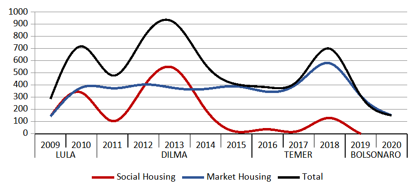 Since 2013, social housing has been drastically reduced. From 2015 to 2020, there was practically no hiring. 2018 was an exception, which can be explained by the intense pressure of housing movements such as the MTST. Market housing remained stable for ten years until 2018, and kept PMCMV active in the last five years. It represents approximately 66% of hiring, although the housing deficit is concentrated in the low-income population (about 91%), who need access to social housing.