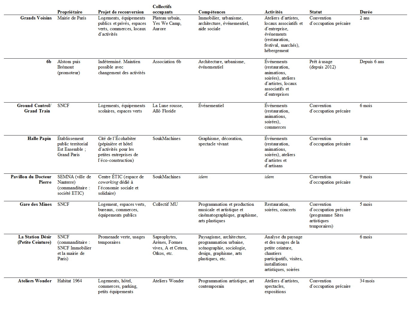 Cette pratique se distingue des squats artistiques, militants, ou « discrets » illégaux (Aguilera 2014). En négociant les conditions d’installation en amont, les collectivités territoriales et les propriétaires n’ont pas à gérer une situation de fait. La régularité devenant une donnée d’entrée, il ne s’agit plus de « gouverner les illégalismes » (Aguilera 2012) mais de tirer parti d’occupations temporaires légales. Cet article cherche à expliquer l’émergence de cette modalité de gestion transitoire des espaces vacants, en se plaçant du point de vue des propriétaires des sites occupés. Celle-ci présente en effet un apparent paradoxe : pourquoi de grands propriétaires fonciers et immobiliers – souvent publics – acceptent-ils, voire contribuent-ils, au développement de l’occupation de terrains qu’ils souhaitent généralement transformer et vendre ?