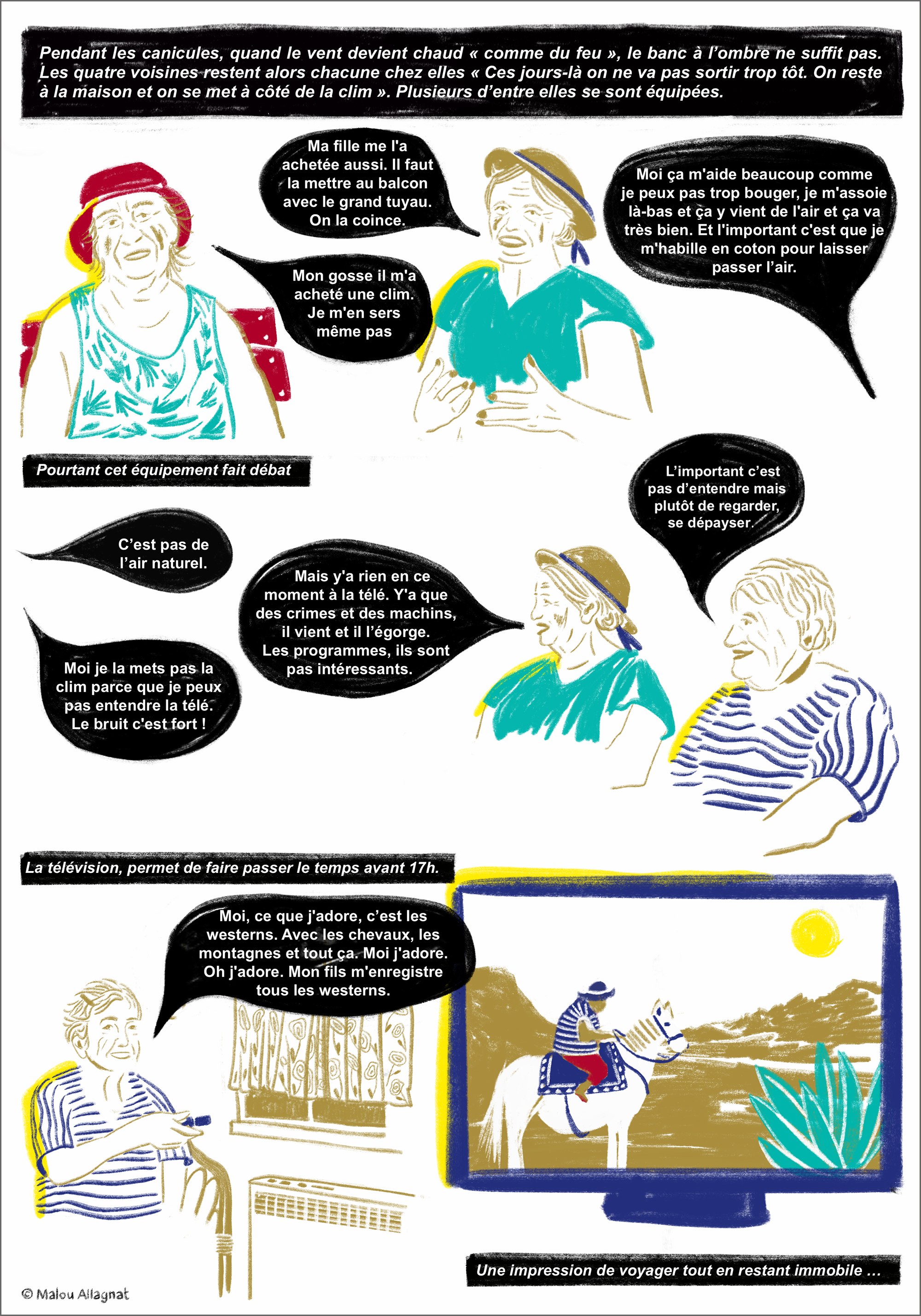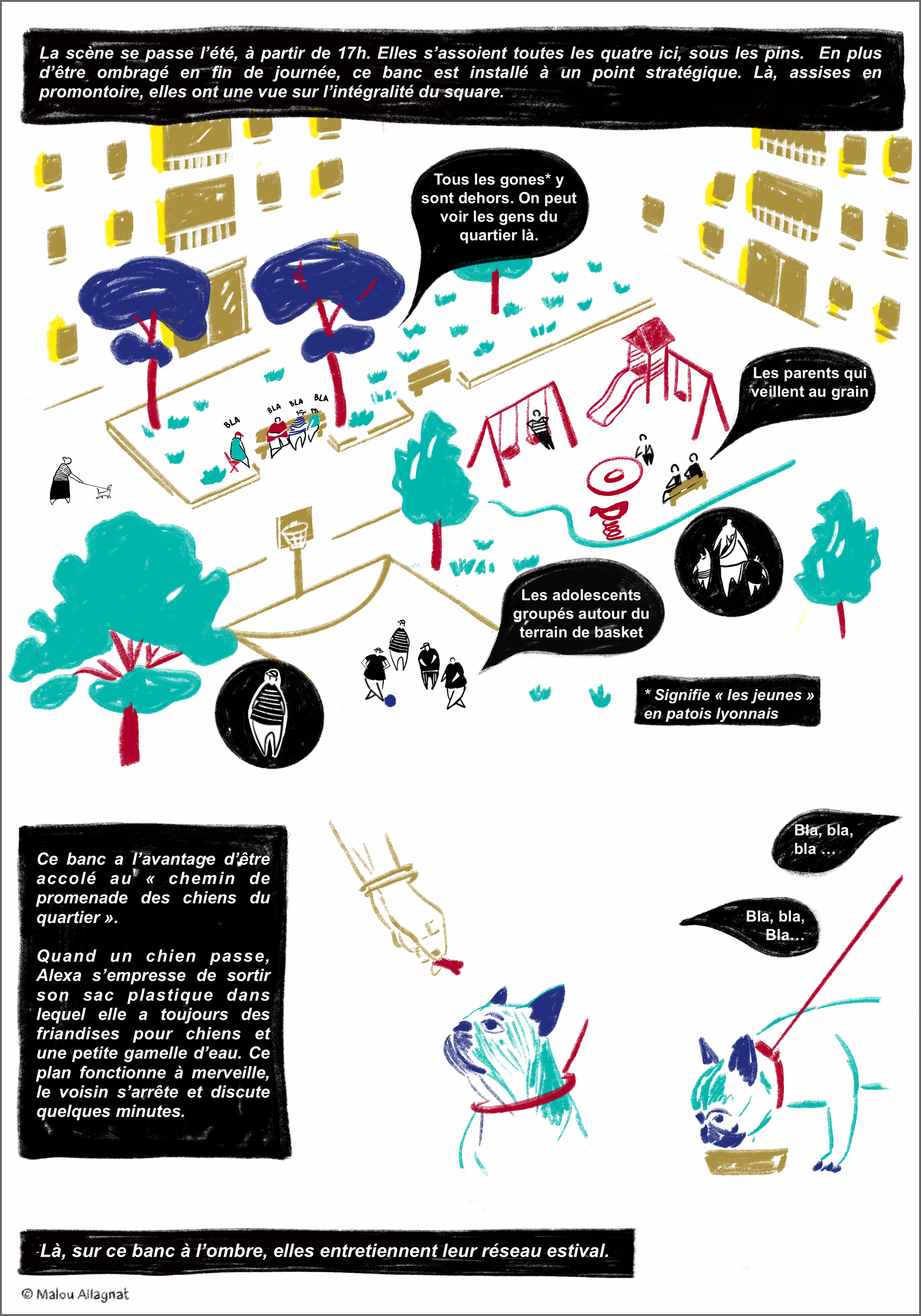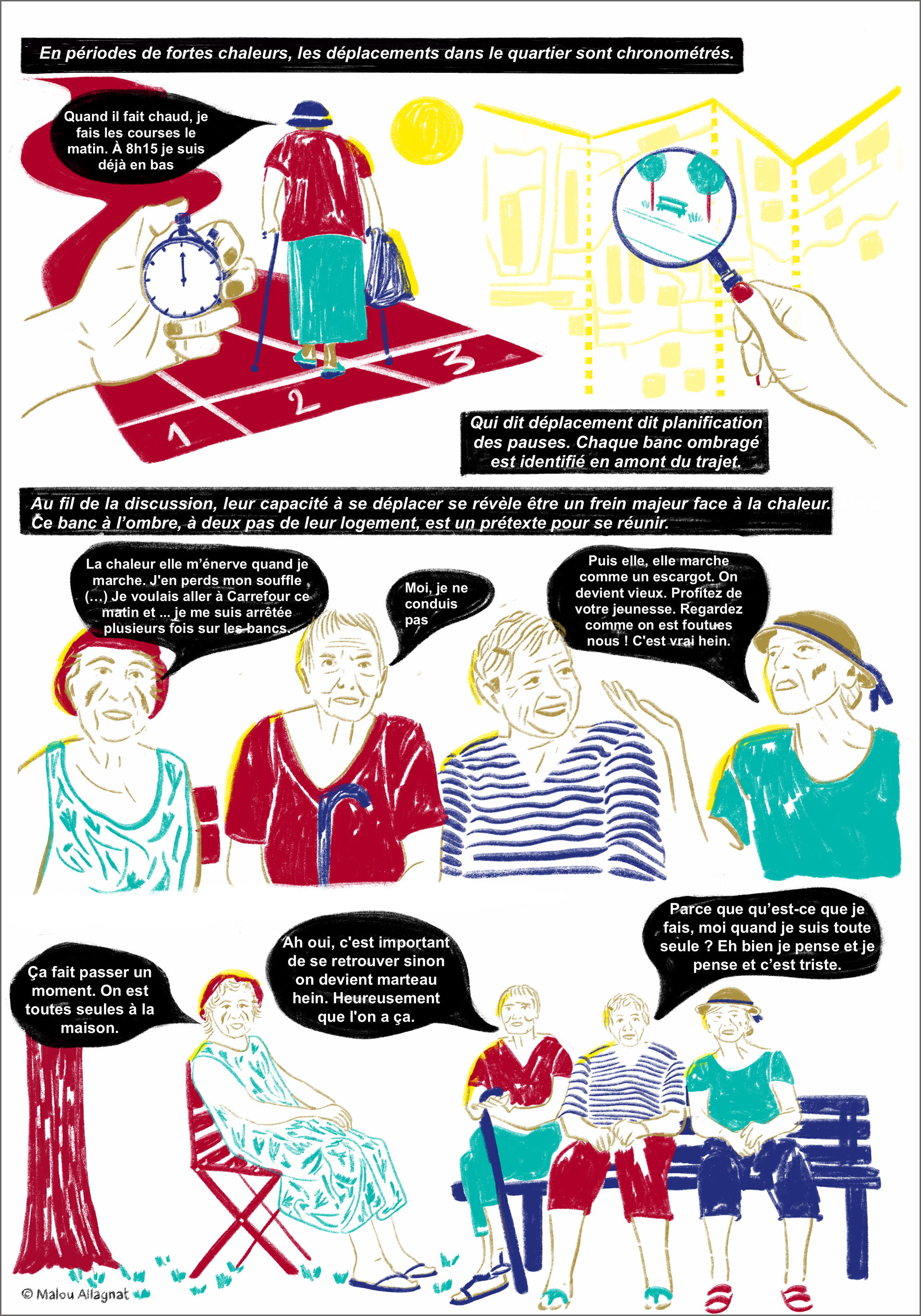Le récit du banc à l’ombre se construit à travers les témoignages de ces quatre femmes âgées qui abordent le sujet de la chaleur par l’intermédiaire de leur immobilité, leur âge, l’importance du lien social et de la veille en période estivale… Ces paroles, mises en dessin ci-dessous [3], sont associées à l’ambiance d’une fin de journée d’été où les espaces publics se remplissent, où les habitants des tours alentour investissent peu à peu chaque interstice.