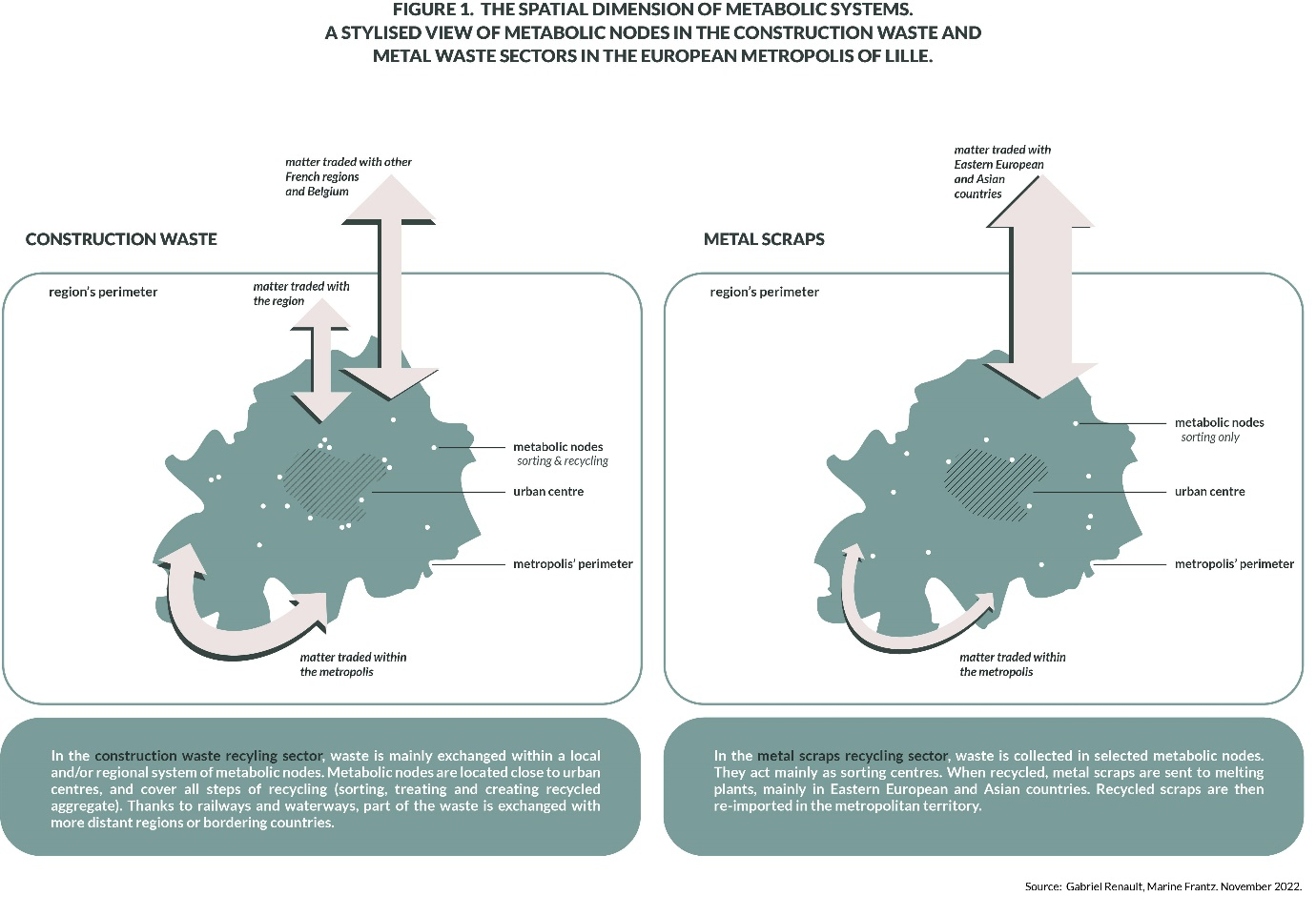 Focusing on actors offers a complementary approach to the more common material flows analysis (MFA). It provides a deeper understanding of the reasons that a circular economy is, or indeed is not, local in its nature. In a case study of the European Metropolis of Lille (Métropole Européenne de Lille in French ; hereafter MEL), we analyzed the local metabolic landscape, from which key infrastructural sites were singled out. Major flows going in and out of the metropolis were passing through a limited group of places, which we labelled “metabolic nodes.” These metabolic nodes centralize and redistribute material flows at different scales and are thus pivotal in determining the nature of a place’s metabolism. The study focused on these places and on the people that run them to bring a new understanding of how the flows are directed from both a contractual and a spatial point of view.