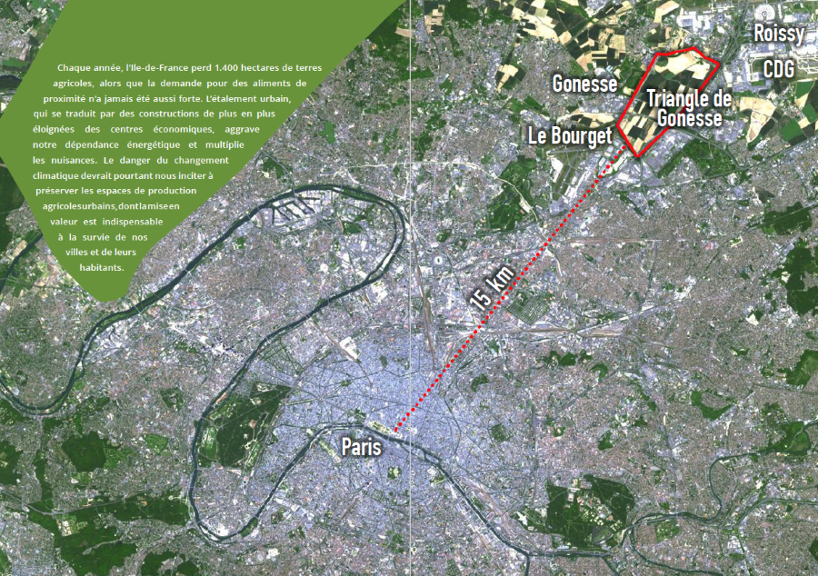 Le nom « Triangle de Gonesse » désigne un espace de 670 ha de terres cultivées aux portes de Paris. Sa forme est délimitée par l’autoroute A1 à l’est et la départementale 317 à l’ouest, une autre voie rapide (figure 2). Ainsi découpé, ce périmètre est resté agricole alors que les terres alentour se sont urbanisées au cours des cinquante dernières années. Il faut dire qu’il est bordé par deux aéroports, Roissy-Charles-de-Gaulle et Le Bourget : les avions survolent le site toutes les minutes environ en journée (toutes les quatre minutes entre minuit et 5 h du matin) [3]. Les plans d’exposition au bruit interdisent tout habitat, expliquant la conservation de ce havre non bâti entre autoroutes, zones logistiques et commerciales.