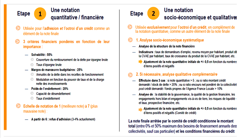 Les opérations de construction de ce circuit financier répondent à l’ensemble des caractéristiques d’un circuit financiarisé : création d’un véhicule d’investissement (en l’occurrence un titre obligataire), création de rendement, réduction du risque, création de liquidité (Chiapello 2020). La grille de notation des collectivités mise en œuvre par l’AFL matérialise de la même manière les attendus des acteurs financiers vis-à-vis de ce que doit être un « bon » emprunteur. L’enquête conduite s’est intéressée à la manière dont cette grille agit sur les modalités d’adhésion à l’agence en créant un premier tri entre les collectivités pouvant potentiellement devenir bénéficiaires du crédit produit par l’AFL et, ensuite, sur les modalités d’octroi des prêts entre les collectivités devenues membres.
