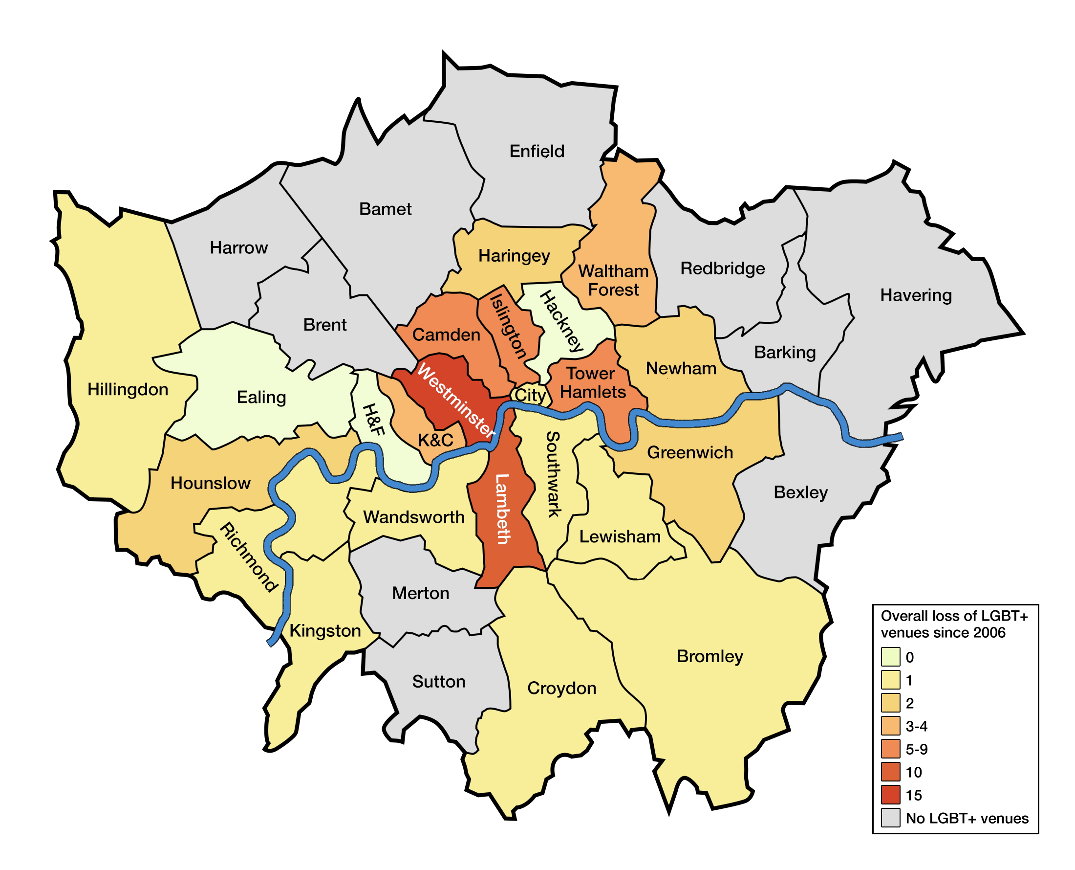 From 2006 to 2016, the number of LGBTQ bars, pubs, and nightclubs in London declined by 58%, falling from 125 venues to 53. Figure 1 shows the spatial distribution of these closures. The impact was most acute in central London.