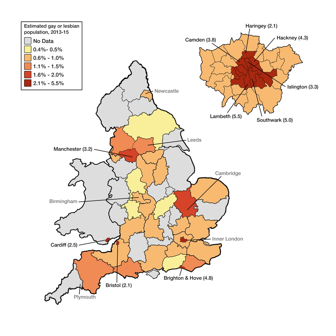 Figure 2 maps the gay and lesbian population in the UK and in London. It challenges explanations for bar closures by revealing persistent and significant residential concentrations of LGBTQ people, especially in Inner London, which is also where we see the greatest rates of closure.