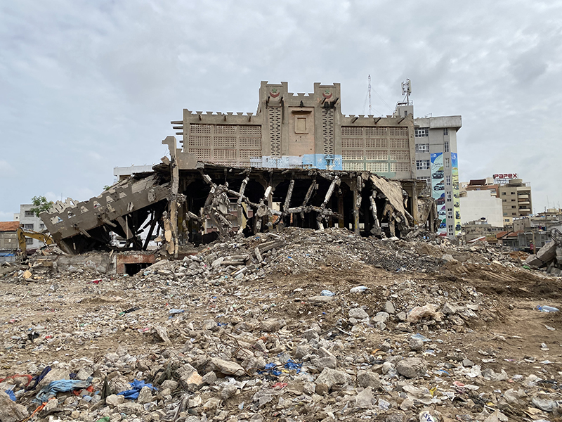 Carole Diop et Xavier Ricou consacrent de belles pages à la riche histoire architecturale de la ville et à sa forte identité culturelle. Depuis sa création, Dakar s’est parée de bâtiments puisant dans différentes inspirations et époques, que les auteurs classent en cinq catégories : le style international, le modernisme, le brutalisme, le « modernisme africain » ou « régionalisme critique » et l’architecture coloniale. La ville est aussi profondément marquée par l’architecture néo-soudanienne, dont le marché Sandaga, détruit en 2021, était un témoignage remarquable (figure 10).