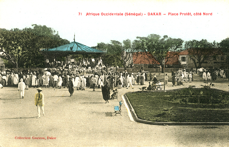 Dans une première partie, Carole Diop et Xavier Ricou reconstituent de façon minutieuse « l’épopée de cette ville/presqu’île mythique » en mobilisant différents types d’archives (cartes, peintures, gravures, aquarelles, photographies). Sans concession ni silence, les auteurs reviennent sur l’histoire de la ville, sa fondation et ses extensions. Ils rappellent que l’histoire de Dakar commence bien avant l’arrivée des « blancs ». La presqu’île de Dakar s’appelle initialement le Cap-Vert et est occupée dès la fin du XIVe siècle par le peuple Lebu. La ville ne prend véritablement forme qu’à partir de 1856, quelques années après l’abolition de l’esclavage en France (1848), lorsque les fonctions coloniales quittent l’île de Gorée pour Dakar. À cette époque, les villages Lebu s’organisent autour de douze grands arbres dénommés Pénc (dont quelques-uns se dressent encore fièrement aujourd’hui sur le Plateau). À côté de ces villages, la ville coloniale prend forme et se dote d’infrastructures majeures. D’abord le port, construit dès 1862, qui marque fortement de son emprise la ville. Le chemin de fer arrive en 1885 et des remblaiements ceinturent le front de mer en guise de fortification. En 1902, la capitale de l’Afrique Occidentale Française (AOF) est déplacée de Saint-Louis à Dakar. Cette dernière accueille désormais sur le Plateau le palais du gouverneur, un hôtel de ville, la place Protêt (qui deviendra la place de l’Indépendance), des hôpitaux et des marchés (figures 1 et 2). En 1914, après une épidémie de peste, le quartier de la Médina voit le jour pour héberger les populations « africaines » (p. 71). La presqu’île est aménagée en damier. Le maillage topographique marque durablement la ville et sa toponymie puisque les noms de quartier, comme le « Point E », sont encore utilisés aujourd’hui. Dans les années 1950, elle connaît une forte augmentation de sa population, à cause notamment de la crise de la production d’arachides. Elle passe de 3 000 habitants en 1869 à 18 000 en 1904, 34 000 en 1926, 92 000 en 1936, 214 000 en 1945 et 465 000 en 1965. Les Sénégalais quittent les zones rurales pour venir se réfugier à Dakar qui n’est pas prête à les accueillir.