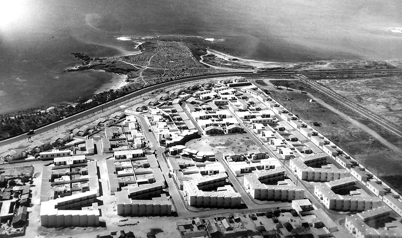 Le premier plan directeur de 1945 dessine la ville moderne avec les allées du Centenaire tandis que l’urbanisation gagne l’ensemble de la presqu’île et les villages au nord de Ngor, Yoff, Cambérène et Ouakam (figure 3). Différentes politiques en matière de production de logements sont testées (Biehler et al. 2015). La SICAP (Société immobilière du Cap-Vert) est créée en 1950, puis la SNHLM (Société nationale des habitations à loyers modérés) (figure 4). Ces deux organismes visent à construire des « cités », composées principalement de villas et immeubles modernes, confortables et bien équipés, à destination des classes moyennes et des fonctionnaires. Les quartiers SICAP existent toujours et demeurent reconnaissables dans le tissu urbain. Au même moment, les premiers buildings percent dans le ciel du Plateau. L’université voit le jour en 1959 (renommée Université Cheikh Anta Diop en 1987).