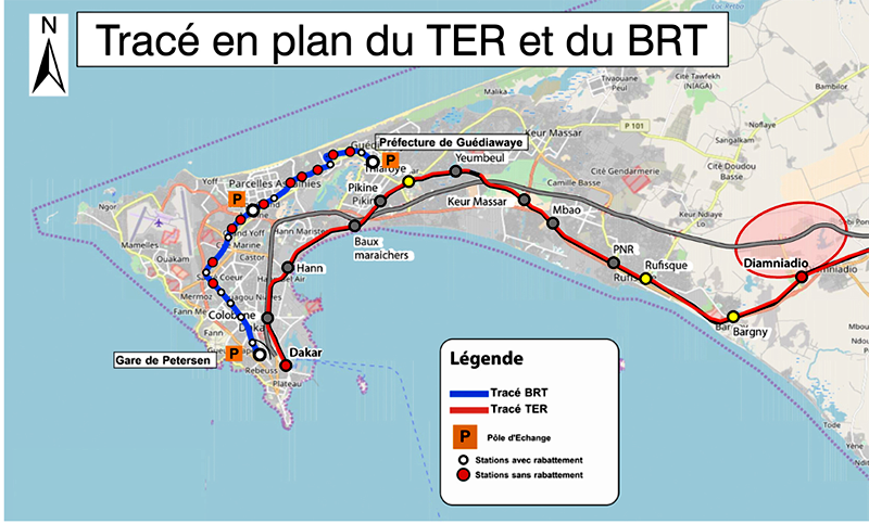 Dix ans plus tard, elle sort de terre, après expropriation et conflits fonciers (Lavigne-Delville et Diongue 2025) : la cité ministérielle accueille les premières institutions, le stade ses premiers matchs, l’université polytechnique ses premières promotions et les quartiers résidentiels leurs premiers habitants (figure 6). Dans le même temps, des infrastructures de transport sont programmées, dans le but de désengorger le Plateau et la presqu’île du Cap-Vert (figure 7). La ligne de Train Express Régional (Kopf 2020), parallèle à celle de l’autoroute, doit permettre de desservir les communes de banlieue, la ville nouvelle et l’aéroport. En mai 2024, le Bus Rapid Transit, en site propre, dessert quant à lui la presqu’île du nord au sud (figure 8).