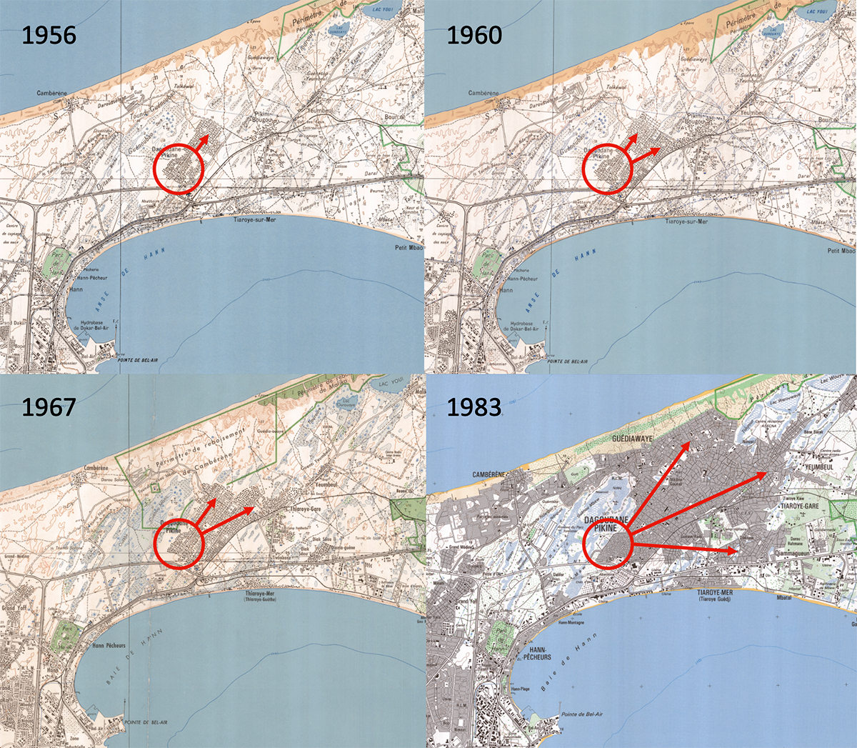 Sources : Cartes de Dakar au 1/50000e, service géographique de l’AOF en 1956 et 1960 ; service géographique de Dakar en 1967 ; IGN France et Sénégal 1983.