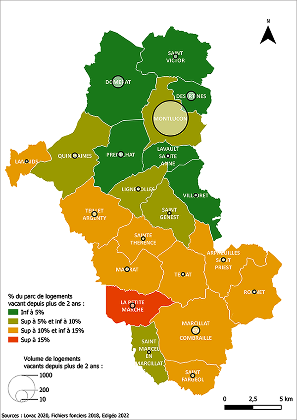 Premièrement, on observe une augmentation du nombre de logements vacants dans plusieurs communes en première couronne de Montluçon (par exemple : Domérat, Saint-Victor). Dans ces communes pourtant attractives, l’augmentation du nombre de logements neufs a accentué l’écart entre l’offre et la demande, générant une détente du parc. De plus, les logements vacants situés dans les secteurs bâtis les plus anciens sont parmi les plus difficiles à remettre sur le marché (absence de luminosité et d’extérieur, difficultés d’accès, etc.).