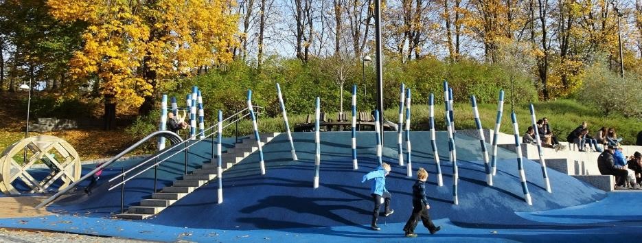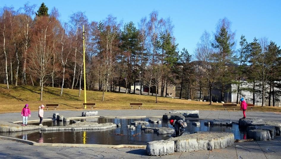 L’observateur français que je suis a ainsi été surpris par l’originalité et la diversité des dispositifs dédiés aux enfants (figure 6). Par exemple Verdenspark, dans le quartier Furuset, propose un plan d’eau ponctué de rochers (figure 7). Ce jeu aquatique dispose d’un double usage ; quand les températures sont positives, les enfants grimpent sur les rochers et évoluent, en sautant de l’un à l’autre, réalisant leur propre parcours. Quand vient l’hiver, sa faible profondeur en fait une patinoire dès que les températures sont négatives. Sans aucune protection particulière, cet aménagement offre, à travers une prise de risque, certes mesurée, « matière à exploration, où l’enfant s’invente des épreuves et se joue de lui-même » (Garnier 2015). Cette distance vis-à-vis de la « recherche impérative du moindre risque » (Gayet-Viaud et al. 2015) aboutit à un espace ludique à la fois peu balisé et sécurisé, qui laisse plus de place à l’indétermination qu’à des comportements attendus, contrairement à une balançoire ou un toboggan.