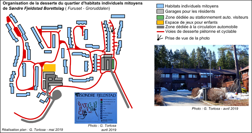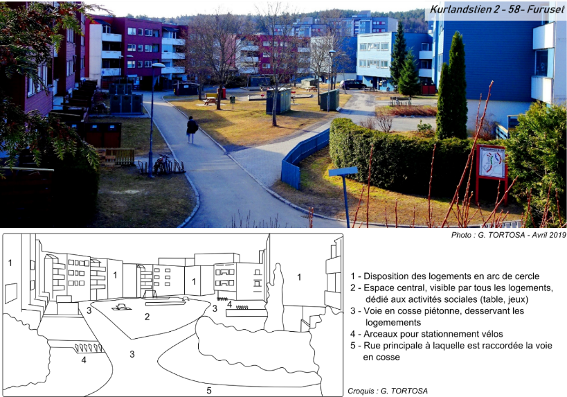 Les principes qui déterminent l’aménagement de ces espaces font écho aux travaux de l’architecte-urbaniste américain Louis Kahn (1901-1974). Considéré comme le premier à avoir manifesté une préoccupation pour l’enfant, celui-ci imagine dans les années 1950, pour Philadelphie, et à contre-courant des idées d’alors, un modèle de desserte alternatif des quartiers résidentiels, articulés autour d’allées automobiles sans issue, avec un réseau de chemins et de placettes à l’écart de la circulation automobile, destiné en premier lieu aux plus jeunes (Weber 2015). La correspondance entre ces principes d’aménagement et la configuration spatiale des quartiers collectifs norvégiens est forte. Dans les deux cas, l’agencement a pour effet de protéger les espaces publics de la circulation automobile.