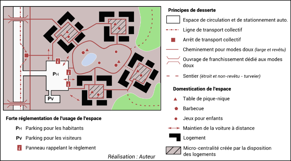 La circulation et le stationnement automobiles sont rigoureusement limités et encadrés (figure 2). Au plus près des logements, ils sont interdits, à l’exception des mouvements de chargement et de déchargement et de l’accès des personnes à mobilité réduite. Ces voies de desserte sont suffisamment étroites pour que deux véhicules ne puissent pas se croiser. En l’absence de sens de priorité établi, ce sont les règles de courtoisie qui régissent le trafic motorisé, incitant les automobilistes à la prudence. Le stationnement n’est permis que dans des zones dédiées, éloignées des habitations. Le cheminement entre la place de stationnement et l’entrée privative de l’habitation s’opère alors par un réseau de voies piétonnes et cyclables, créant une discontinuité spatiale de plusieurs dizaines de mètres entre ces deux espaces (figures 3 et 4). Cette rupture de charge imposée, en relativisant la souplesse du porte-à-porte, réduit la performance de l’automobile.