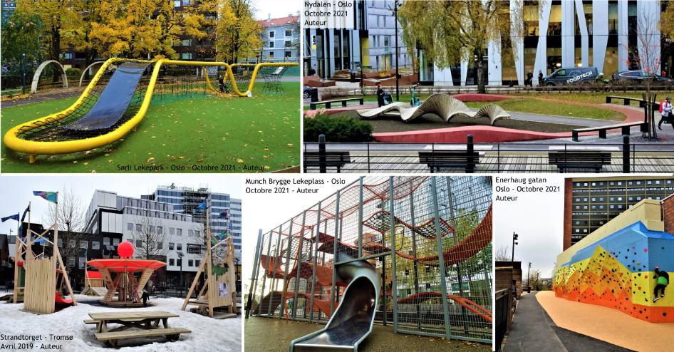 Un autre point de singularité de ces aires de jeux est leur intégration dans leur environnement. Situées au sein d’espaces publics affranchis de la circulation motorisée, elles sont directement ouvertes sur l’extérieur, sans clôture. Ainsi, la tendance observée ailleurs à l’« archipélisation » (« islandization »), c’est-à-dire à l’enfermement des enfants dans des espaces ludiques clos (Christensen et al. 2000), prôné par le Mouvement moderne, qui va de pair avec la poursuite du déclin de leur présence autonome dans la rue (Gayet-Viaud et al. 2015 ; Garnier 2015), ne se retrouve pas. Des travaux, menés en France et en Italie, ont en effet montré l’impact de la circulation automobile sur la disparition des plus jeunes de l’espace public, par un double effet, celui de la réduction des espaces de jeu disponibles et de la perception des risques encourus (Rivière 2021). Les aires de jeux, en Norvège, sont moins sécurisées et balisées car elles sont situées, plus largement, dans des espaces urbains plus hospitaliers aux enfants.