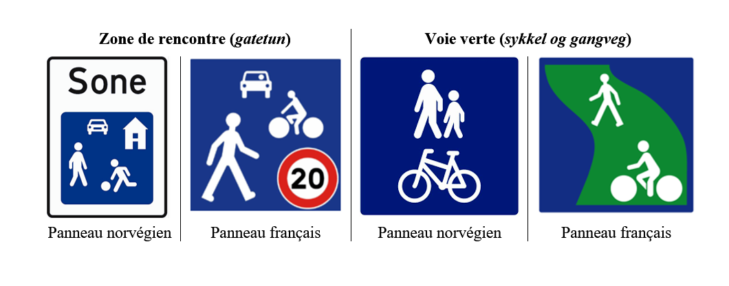 Cette sensibilité réglementaire vis-à-vis des jeunes se retrouve dans la signalétique routière. L’analyse comparative de panneaux français et norvégien est de ce point de vue intéressante. Alors que dans le cas de la zone de rencontre, le panneau norvégien se teinte d’une dimension domestique en reprenant la figure de l’habitation et de l’enfant pour qui la rue est un espace de jeu, son équivalent français reste dans un registre circulatoire et « adultocentré », où seuls sont représentés un piéton, un cycliste et un automobiliste, sans référence à l’enfant, au jeu ou au foyer. Il en va de même concernant les panneaux annonçant une voie verte, où seul le panneau norvégien reprend la figure de l’enfant (figure 9).