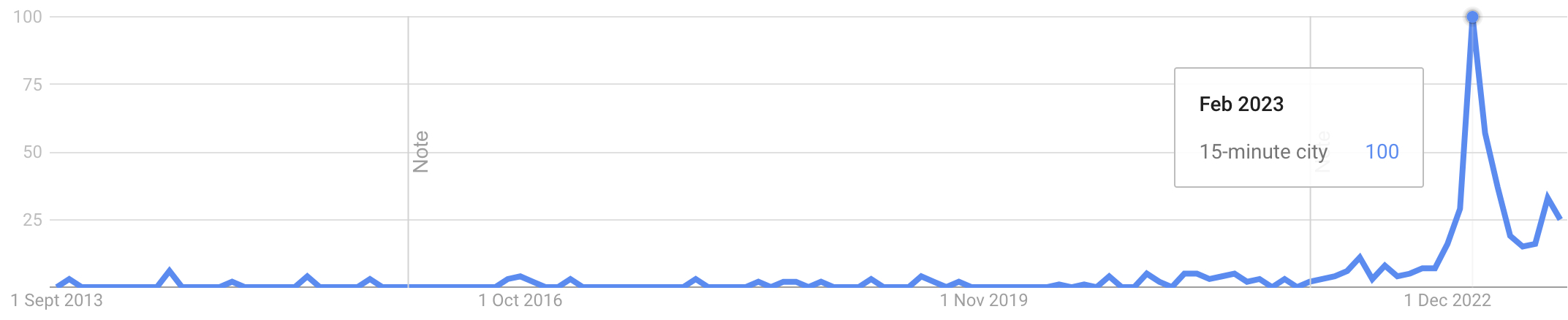 The backlash against 15‑minute cities quickly spread across the Anglophone world. Figure 1 presents data from Google Trends about user searches for the term “15‑minute city” from September 2013 to September 2023. The graph shows peak interest in February 2023 when the far right protested Oxfordshire’s spatial plan. This suggests Britain’s far right has been able to use Oxfordshire as symbol of resistance against 15‑minute cities.