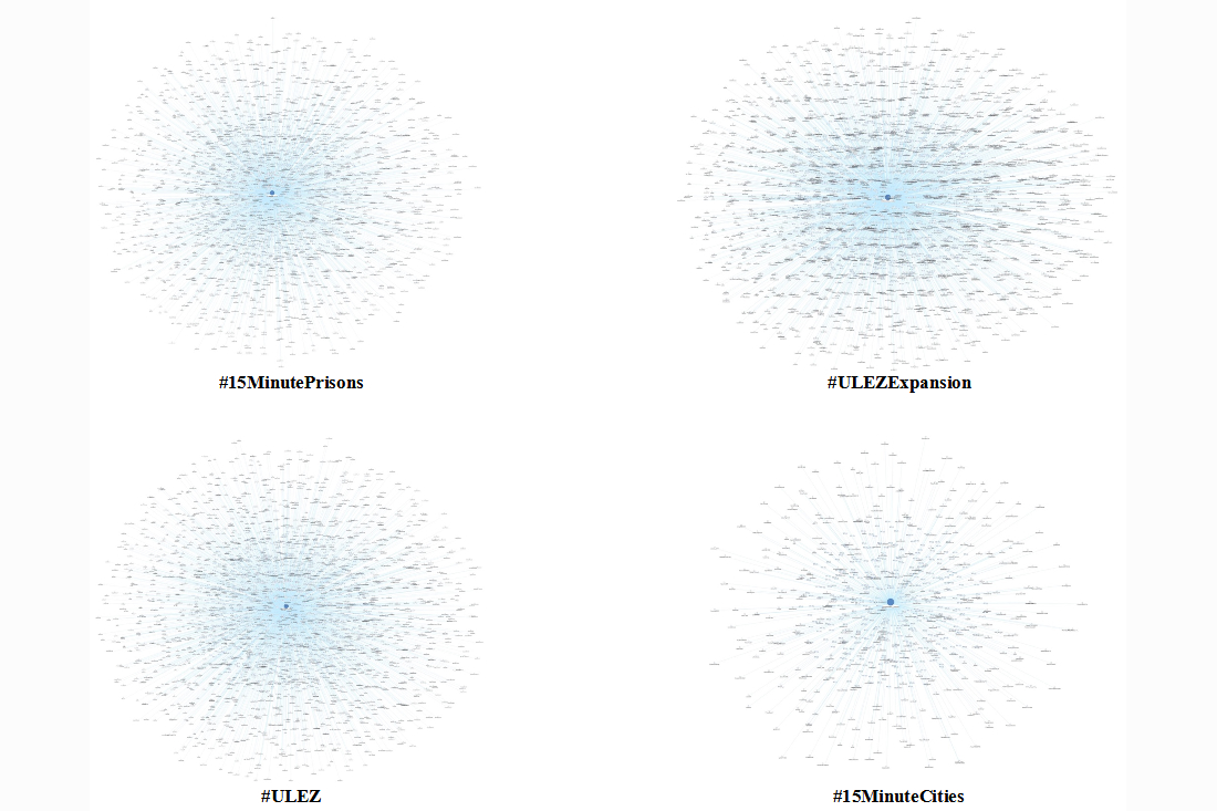 Far-right activists have used Twitter to diffuse the 15‑minute city backlash. I scraped Twitter posts that included #15MinuteCities, #15MinutePrisons, #ULEZ, [1] and #ULEZExpansion from April 1-10, 2023. During this period, a far-right media outlet in Britain, Wide Awake Media, played a key role in promoting disinformation about 15‑minute cities. As a proportion of all tweets, Wide Awake Media was connected to 83.7% of #15MinutePrisons tweets, 53.8% of #ULEZExpansion tweets, 37.6% of #ULEZ tweets, and 9% of #15MinuteCities tweets. Figure 2 visualizes the centrality of Wide Awake Media for each of these hashtags. It illustrates the accounts that retweeted or mentioned Wide Awake Media posts related to these topics during the timeframe.