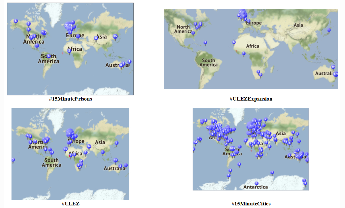 The spread of this backlash on social media also spanned geographic space. Figure 3 shows #15MinuteCities, #15MinutePrisons, #ULEZ, and #ULEZExpansion were tweeted by users around the world. British news outlets have reported backlashes in the southwest, eastern, northwest, and Yorkshire (north-central) regions of England. Reporters have noted the importation of Britain’s far-right frame to Ireland, Canada, and Australia. The backlash against 15‑minute cities in Britain has thus impacted planning systems around the world and could affect more in the future. This archival data highlights the interdependency of local backlashes against 15‑minute cities. Social media platforms connect these cases by giving far-right activists a pipeline to diffuse populist frames about and strategies to resist sustainable development initiatives by local governments.