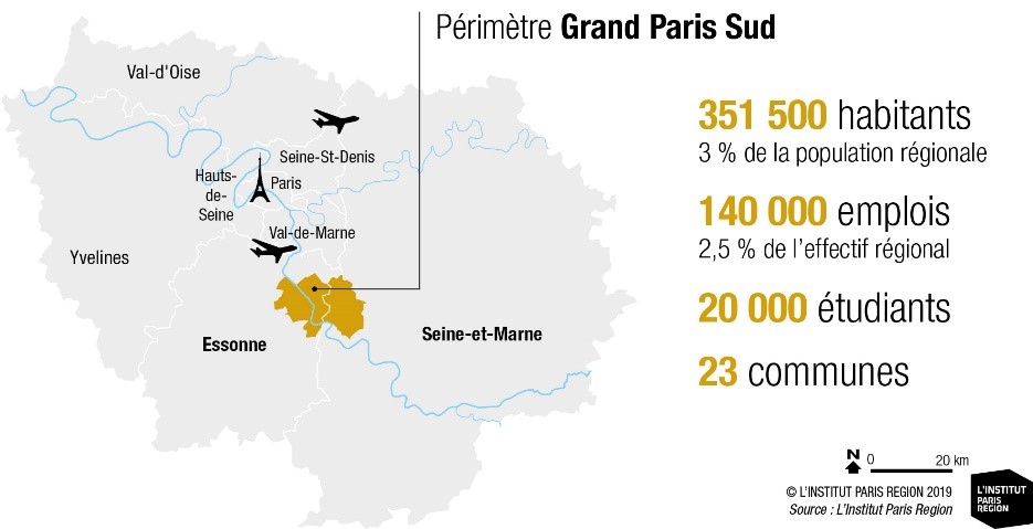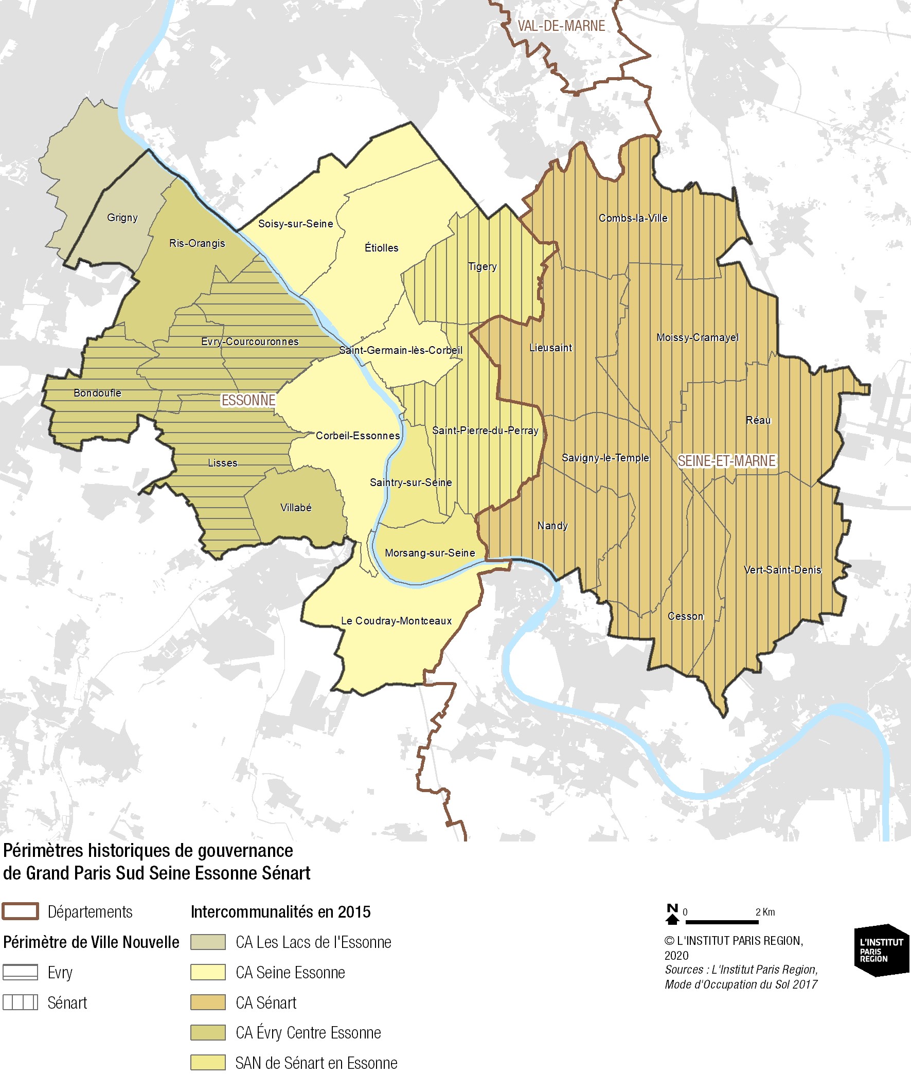 Le territoire de Grand Paris Sud est situé au sud-est de la capitale, à cheval sur deux départements – l’Essonne et la Seine-et-Marne. Il compte un peu plus de 350 000 habitants pour vingt-trois communes, dont la récente commune nouvelle d’Évry-Courcouronnes. Sur le plan institutionnel, Grand Paris Sud est une communauté d’agglomération issue d’une fusion, en 2015 [1], de cinq anciennes intercommunalités – les communautés d’agglomérations (CA) Les lacs de l’Essonne, Seine Essonne, Sénart, Évry Centre Essonne et le Syndicat d’agglomération nouvelle (SAN) de Sénart en Essonne [2] – réalisée à marche forcée dans le cadre du schéma régional de coopération intercommunale [3]. Ce n’est que sous la contrainte forte du représentant local de l’État et de la mobilisation de l’ex-maire d’Évry, Manuel Valls, devenu Premier ministre, que cette agglomération a été constituée, en dépit des souhaits exprimés par les élus locaux et de l’histoire des intercommunalités de ce territoire, issues de deux ex-villes nouvelles : Évry et Sénart. Le préfet de l’Essonne de l’époque, Bernard Schmeltz, le reconnaissait d’ailleurs clairement : « Le législateur a donné au préfet des pouvoirs exorbitants du droit commun pour créer de grandes agglomérations qui ne seraient pas nées spontanément. Il s’agit de créer de grands ensembles en grande couronne pour faire contrepoids à Paris et à la petite couronne [4]. »