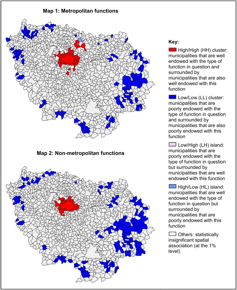 Source : Insee 2009 (Emplois au lieu de travail – Jobs by place of work). Maps created using GeoDa software (Anselin, Syabri and Kho 2006).
