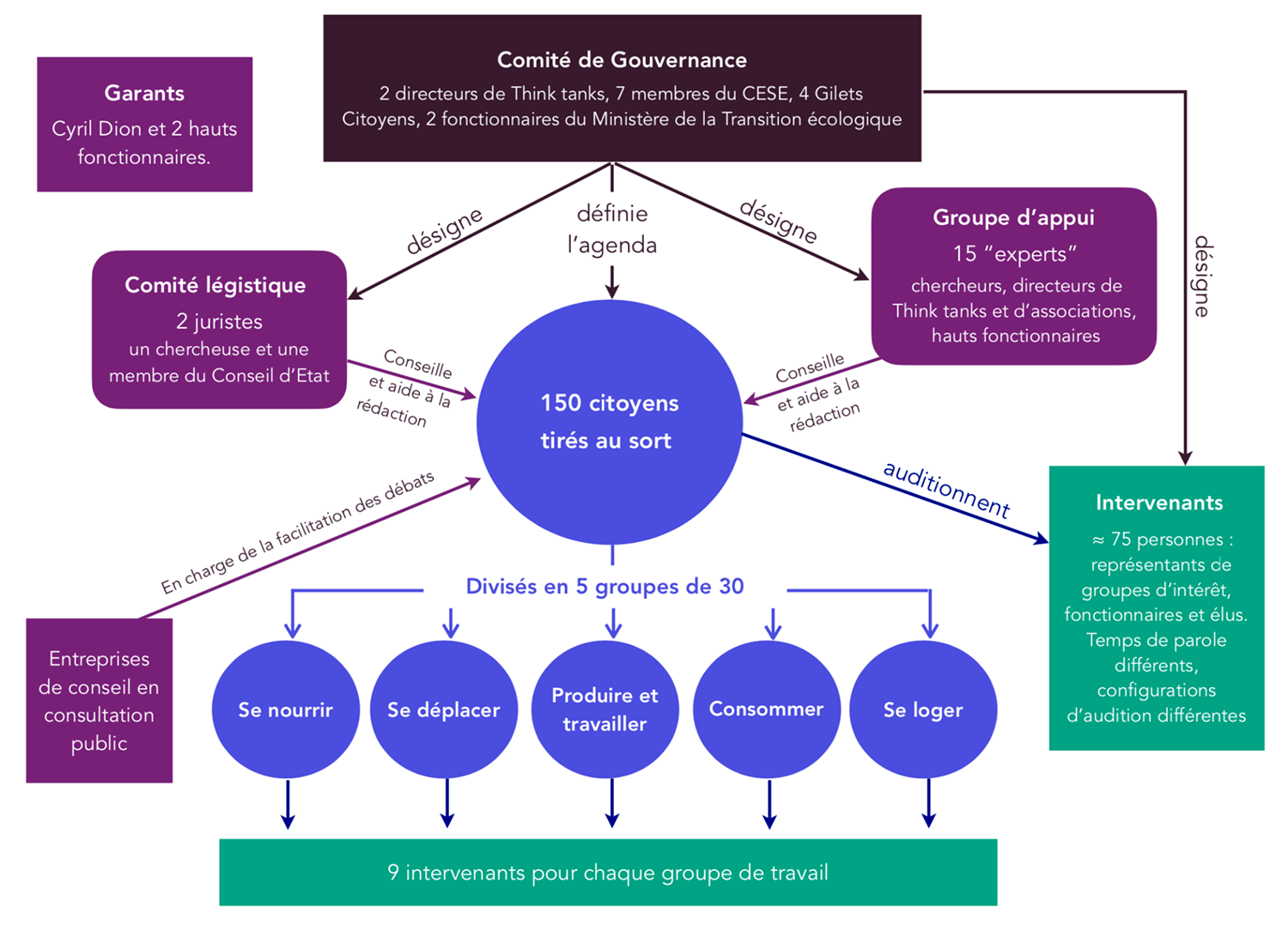 La CCC a été présentée comme un mécanisme indépendant et démocratique. Supervisés par un Comité de gouvernance et assistés par un groupe d’appui composé de représentants d’organisations diverses, les citoyens ont été invités à « définir les mesures structurantes pour parvenir, dans un esprit de justice sociale, à réduire les émissions de gaz à effets de serre d’au moins 40 % d’ici 2030 par rapport à 1990 [2] ». Les organisations environnementalistes sollicitées autour de la CCC (Greenpeace, la Fondation Nicolas Hulot…) ont d’abord réagi avec un certain scepticisme, n’y voyant qu’une manœuvre du gouvernement consistant à brandir « la participation des citoyens pour dissimuler son inaction [3] ».