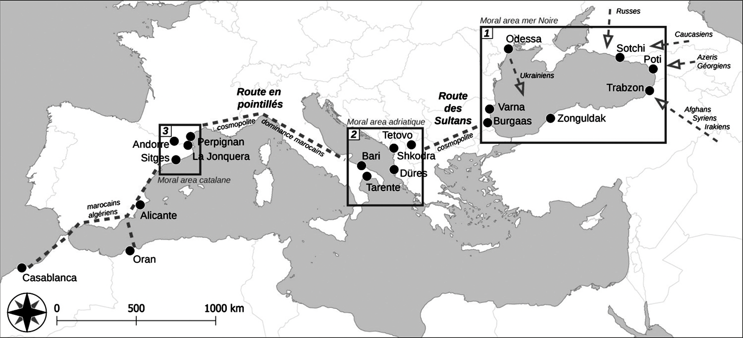 Diverses recherches que j’ai menées depuis 1985 ont concerné l’agrégation en groupes cosmopolites de religions et de nationalités, à partir de migrations mono-identitaires (figure 1). L’un des premiers cas que j’ai pu mettre en évidence a été ce rapprochement entre des Afghans, des Turcs, des Russes et des Ukrainiens (Kochubey 2012) pour la revente de produits made in SEA et commercialisés dans l’espace européen « entre pauvres ». Il s’agissait de créer un marché parmi des « pauvres relatifs » qui n’avaient pas accès au marché des grands distributeurs mais désiraient partager, surtout pour leurs enfants, les avantages d’accès à des réseaux que permettait l’informatique. L’engouement pour ce « marché parallèle » concernait des populations villageoises ou urbaines sans accès aux magasins des grands distributeurs. Et Trabzon prenait une place essentielle : elle recevait les populations afghanes, iraniennes, syriennes et émiraties et, souvent, les Géorgiens et Azéris passant par Poti, port géorgien voisin de Trabzon et particulièrement mal équipé. Les groupes de revendeurs de huit à douze personnes mêlant diverses obédiences chrétiennes et musulmanes se fractionnaient le temps de transactions, puis se reconstituaient pour commercer dans des populations plus dispersées. Trabzon est ainsi connectée à la Bulgarie (port de Varna), puis, via les routes terrestres des Balkans, à la côte albanaise de l’Adriatique et à l’Italie.