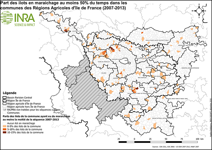 La présence de cultures maraîchères extensives, comme les pommes de terre (liées à la proximité des industries agroalimentaires, dans une région comme la Picardie, par exemple) peut expliquer ce résultat. Il n’est pas exclu que d’autres facteurs interviennent, comme les caractéristiques des sols ou la pression foncière et urbaine. Paradoxalement, les exploitations qui déclarent une valeur de production majoritairement due au maraîchage consacrent dans la plupart des cas plus de surfaces cultivées aux grandes cultures (les grandes cultures représentent en effet 77 % des surfaces de ces exploitations à l’échelle du Bassin parisien central).