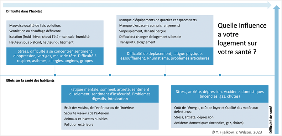 Dans une première phase, nous, les chercheurs, proposons des « cafés pédagogiques » auprès des habitants. À l’occasion d’une réunion, dans le hall d’accueil, en pied d’immeuble ou dans la cour, nous présentons aux habitants qui veulent bien s’arrêter l’impact de la qualité du logement sur la santé physique et mentale, au moyen d’une affiche didactique (figure 2). Ces moments visent à rendre les habitants attentifs à ces questions en les associant, comme participants volontaires, à l’enquête.