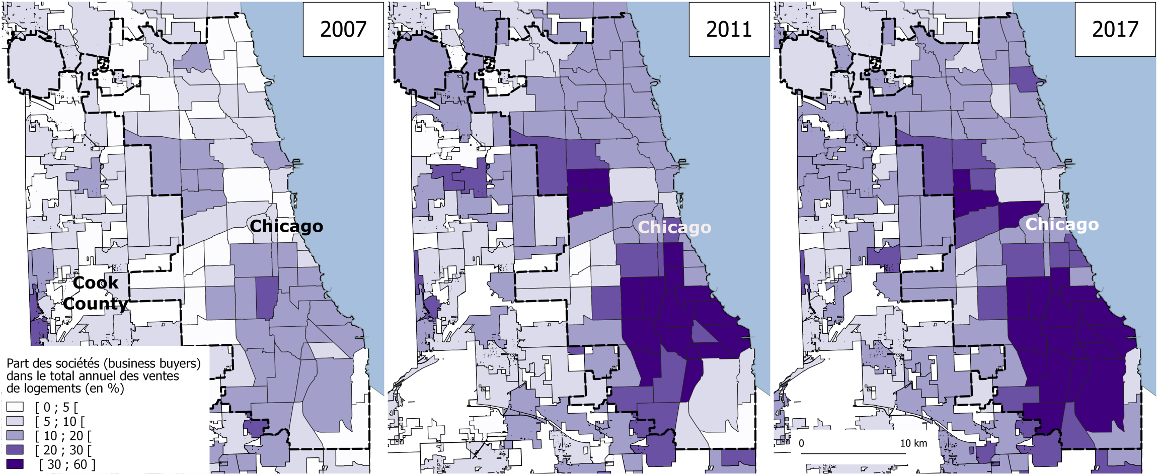 Avec la crise de 2008, la multiplication des saisies immobilières par les banques a eu pour conséquence la nette diminution du nombre de propriétaires et l’arrivée importante d’investisseurs sur les marchés résidentiels (Ellen et al. 2015). Dans les quartiers en déclin du sud et de l’ouest de Chicago (South Side, West Side), plus d’un tiers des achats de logements sont le fait de sociétés après 2011 (figure 1).