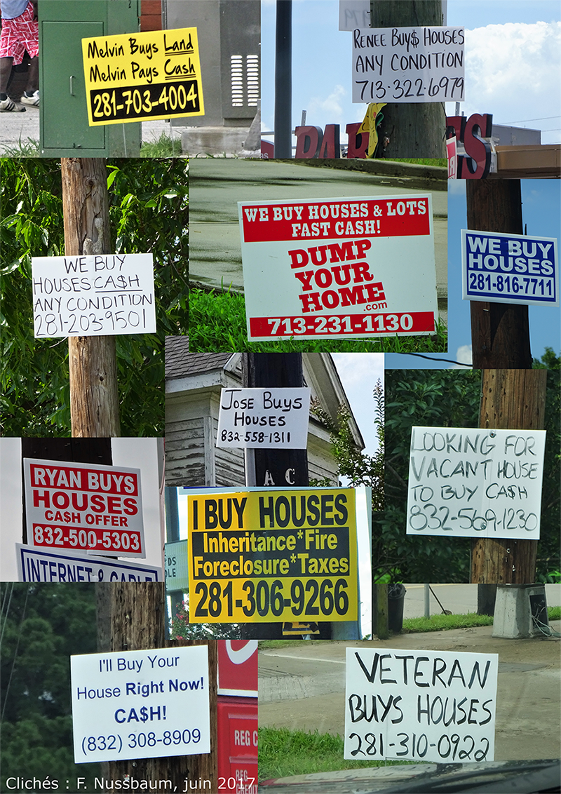 Bien que paradoxal, le choix de concentrer ses acquisitions sur l’immobilier dévalorisé peut se révéler plus rentable que les investissements ciblant les biens de moyenne gamme. L’essentiel du calcul de rentabilité repose sur le prix d’achat particulièrement bas des propriétés dévalorisées, du fait de la faible qualité de bâtiments peu ou pas entretenus, de leur taille modeste et de leur localisation peu attractive, mais aussi de la précarité de leurs propriétaires. Les biens dévalués font ainsi l’objet de modes de transaction spécifiques : vente aux enchères de propriétés saisies par les banques (foreclosures), vente aux enchères pour taxes impayées (tax sales), ou encore vente par des particuliers de propriétés menacées de saisie (short sales) dans des conditions à l’avantage de l’acheteur. La menace d’une saisie ou d’une démolition participe dès lors de la dévalorisation de ces logements au moment de leur acquisition. Dans les quartiers dévalorisés, une multitude de pancartes publicitaires proposent ainsi d’acheter des maisons concernées par des dettes ou des saisies, et ce quel que soit leur état matériel (figure 2).