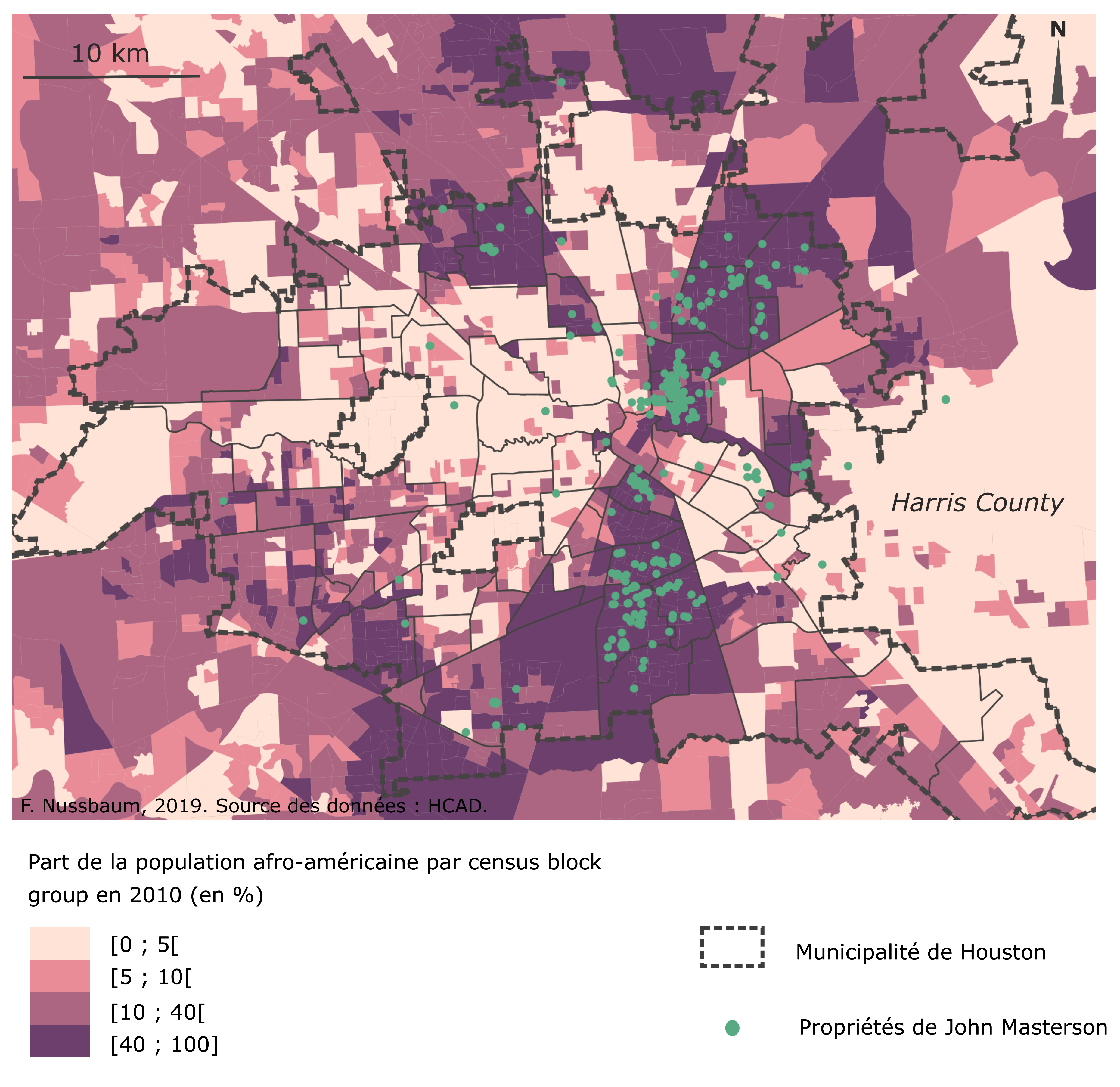Les territoires ciblés se caractérisent en outre par la concentration de ménages issus des minorités ethniques, parfois non anglophones et dans certains cas en situation irrégulière. Les habitants des quartiers dégradés connaissent mal leurs droits et la législation relative à la propriété, ils sont donc plus souvent victimes d’escroqueries qui participent de leur appauvrissement (Lees 2016). Ces populations peu solvables étant exclues de l’accès au crédit conventionnel, elles sont plus fréquemment victimes de contrats fallacieux pour l’acquisition d’un bien immobilier. C’est notamment le cas à Houston, où un investisseur qui possède en 2017 plus de 380 propriétés dans des quartiers majoritairement afro-américains (figure 3) est accusé d’avoir fait signer des contrats de location-accession à des ménages hispanophones en facturant des frais injustifiés et en n’enregistrant pas correctement les propriétés auprès du cadastre, profitant de l’incompréhension des acheteurs pour les tromper et revendre leur bien à d’autres ménages [8].