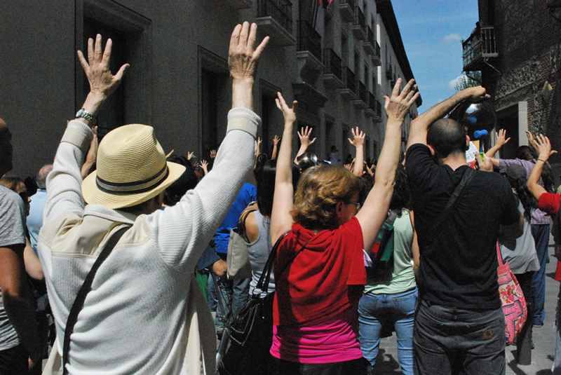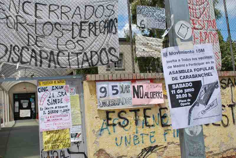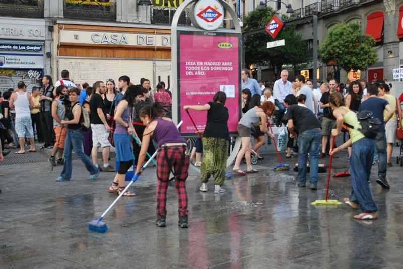 Le risque de démobilisation issu de cette dispersion des participants est en partie endigué par les premières victoires qu’enregistre le mouvement. L’arrêt d’une « rafle » d’immigrés à Carabanchel, où deux cents participants s’engouffrent spontanément dans la station de métro d’Oporto après en avoir eu écho à la fin de l’assemblée du 4 juin, fait rapidement le tour des quartiers populaires de Madrid, qui proposent de réitérer l’expérience dans leur quartier. L’« effet de démonstration » est aussi puissant lors de l’empêchement d’une expulsion de logement le 15 juin : à un appel lancé par l’assemblée populaire de Tetuán, avaient en effet répondu des indignés de tout Madrid. Des connexions sont ainsi rapidement établies entre les différents quartiers de la ville et avec des organisations sociales existantes (comme les brigades de défense des droits de l’homme ou la plateforme des victimes de l’hypothèque), afin de mener des actions directes contre les principales conséquences sociales de la crise économique : expulsions de logement, rafles d’immigrés, fermetures de services sociaux, licenciements, etc. Si le mouvement aspire également à définir des lignes d’action à plus long terme afin de transformer le système politique et économique, ces actions concrètes sont un gage de continuité. C’est ce qu’exprime cet homme d’une soixantaine d’années à l’assemblée populaire de Carabanchel le 11 juin, au sujet de l’occupation d’un centre d’accueil pour handicapés fermé depuis peu dans le quartier : « On doit enregistrer une victoire, même si elle est petite, pour continuer à lutter ». Parmi les 35 commissions et groupes de travail qui font un bilan de leurs activités à l’assemblée générale de Puerta del Sol, le dimanche 12 juin, celle de coordination interne prévient : « On a déjà fait beaucoup de bruit, mais ce n’est qu’un début ! ».