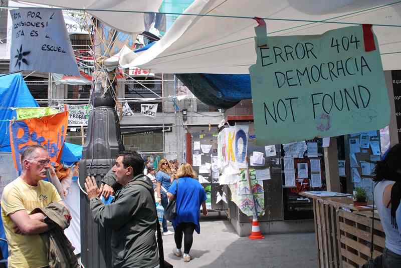 Si la recherche de consensus pose moins de problèmes à l’échelle locale, le risque d’une dispersion, en revanche, apparaît important. D’une part, la multiplication des commissions et groupes de travail tend à diviser les participants en une multitude de sous-groupes, qui n’attirent pas toujours assez de monde pour fonctionner. Les assemblées populaires de Chamberí et de Moratalaz, où plus d’une douzaine de commissions et groupes de travail ont été créés sur le modèle de Puerta del Sol, font part de leurs difficultés à mobiliser pour certaines réunions. À l’inverse, le quartier de Carabanchel, qui a choisi de fonctionner avec moitié moins de sous-groupes (et qui est aussi le deuxième district le plus peuplé de Madrid, avec plus de 250 000 habitants), parvient à y mobiliser des dizaines de participants.