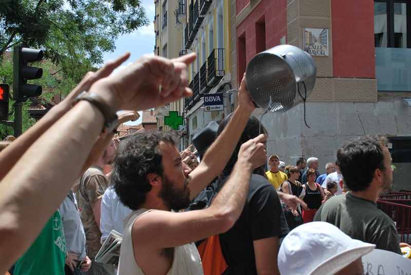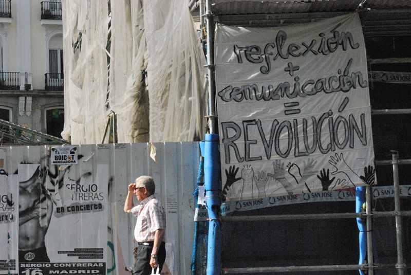 On peut craindre, d’autre part, une dispersion dans la multiplication des appels à manifester – les premières assemblées populaires de Madrid ont annoncé de nombreuses manifestations en juin et juillet, pour protester par exemple contre la privatisation d’un canal, les coupes dans le budget de l’éducation ou la réforme des retraites. Un participant regrette cette inflation : « Je ne peux pas être tous les jours dans la rue ! Il faut éviter que la dispersion diminue le dynamisme du mouvement. Nous avons beaucoup de choses à faire au niveau local, il ne faut pas seulement faire de grandes manifestations ». La protestation organisée le samedi 11 juin devant l’Hôtel de ville, au moment de l’investiture de la nouvelle équipe municipale, a entraîné une moindre affluence dans les assemblées de quartier prévues ce jour-là, voire leur annulation comme à Lavapiés – une décision prise par consensus, même si un participant estime qu’« il faudrait au moins que les commissions nous informent de leur travail, pour maintenir la force de l’assemblée du quartier. Maintenant on a plus besoin de ça que de protester ». Ces grandes manifestations communes à l’ensemble des quartiers de Madrid permettent toutefois d’éviter un enfermement local du mouvement, alors que les origines de nombreux problèmes soulevés par les indignés (comme la crise économique et politique) sont globales. Elles témoignent également de la vitalité du mouvement après la levée du campement Puerta del Sol. Ainsi, la journée d’action contre le Pacte de l’Euro, dimanche 19 juin, a rassemblé environ 40 000 manifestants dans les rues de Madrid, organisés en six colonnes partant des périphéries de la ville, et plus de 200 000 en Espagne [5]. Depuis, des marches populaires sont organisées à travers le pays, au départ notamment de Valence et de Barcelone, et il est prévu qu’elles se rejoignent à Puerta del Sol le 23 juillet.