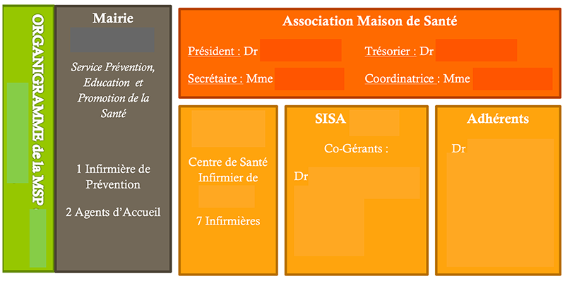 La MSP est portée par une association et les financements collectifs sont perçus par une société interprofessionnelle de soins ambulatoires (SISA). Cette MSP a la particularité d’être associée à un centre de soins infirmiers, et n’a pas d’infirmières libérales.