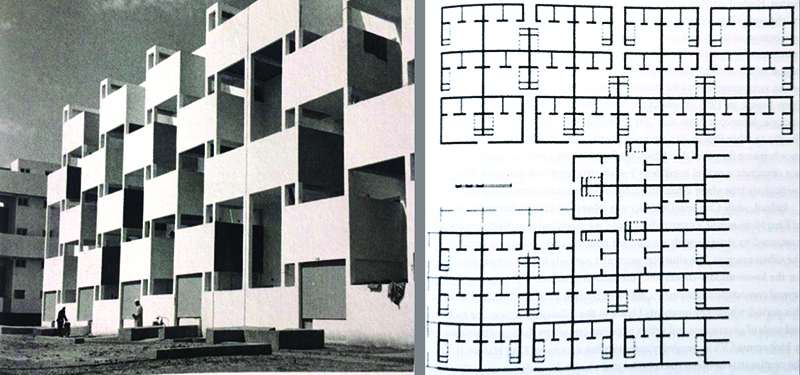 À gauche : Bâtiment à l’achèvement (1952). Source : Photothèque de l’École nationale d’architecture, Rabat ; À droite : Trame « 8 × 8 ». Fonds Écochard. Strava, 2022.