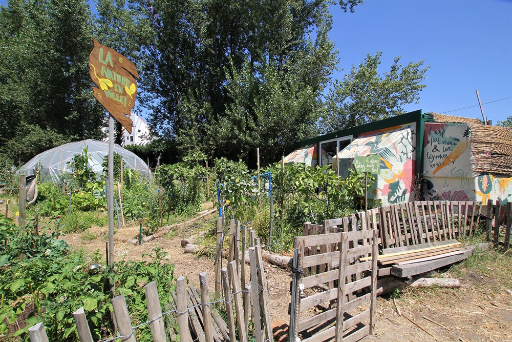 Derrière le slogan « La nature en ville » se trouve un espace dédié à l’agriculture urbaine. À droite de l’image, un Tétrodon réhabilité servant de cabane de jardin, et à gauche, un dôme géodésique réalisé à partir de matériaux de récupération abritant des cultures potagères.