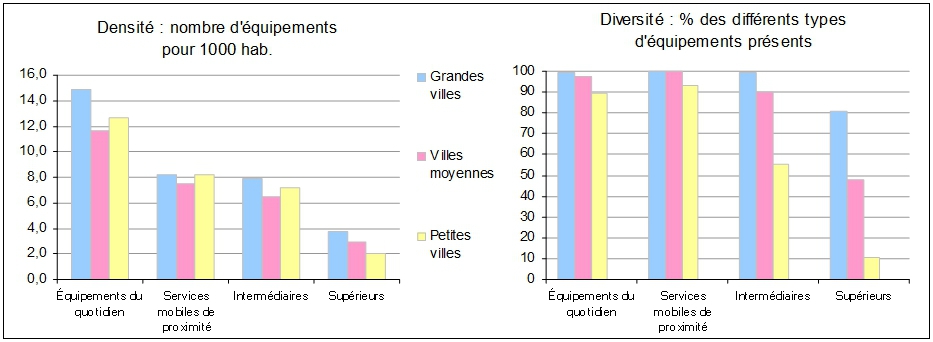 - les équipements supérieurs, présents dans moins de 5 % des communes françaises (on en dénombre quatre-vingts : piscines couvertes, gendarmeries, hôpitaux, lycées, etc.).