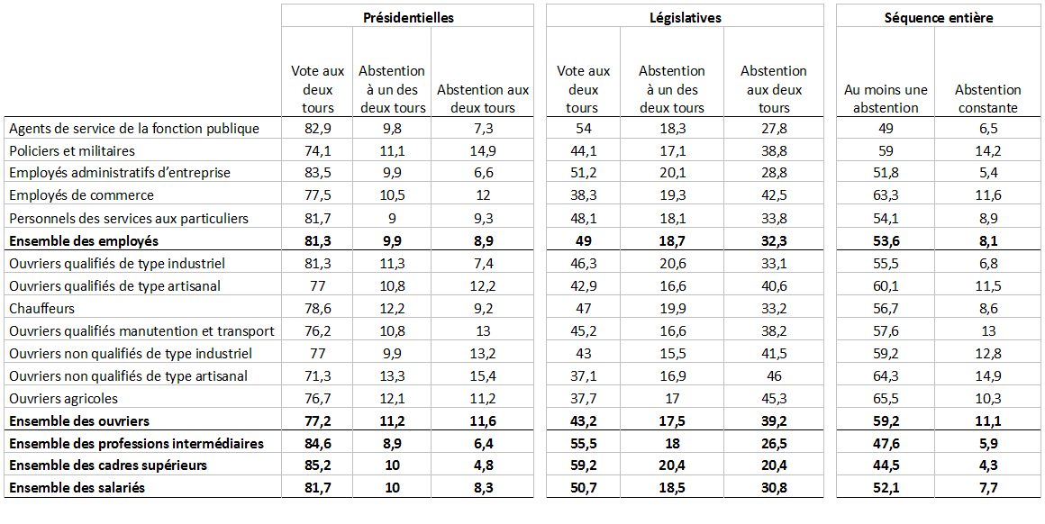 L’examen des taux de participation aux élections présidentielle et législatives de 2012 permet de formuler trois résultats. Tout d’abord, parmi les salariés, plus on s’élève dans la hiérarchie des emplois, plus la probabilité de s’abstenir est faible. Ainsi, alors même que l’élection présidentielle demeure la plus mobilisatrice dans notre système électoral, seuls 77 % des ouvriers inscrits votent aux deux tours de l’élection de 2012, contre 81 % des employés, et 85 % des professions intermédiaires et des cadres supérieurs (tableau 1). Les écarts entre catégories socioprofessionnelles sont sensiblement plus élevés lors des élections législatives, nettement moins mobilisatrices depuis qu’elles suivent immédiatement l’élection présidentielle, à la suite de l’introduction du quinquennat présidentiel et de l’inversion du calendrier électoral en 2002 : 43 % des ouvriers votent aux deux tours, contre 49 % des employés, 56 % des professions intermédiaires et 59 % des cadres supérieurs. Enfin, 11 % des ouvriers inscrits sont des abstentionnistes constants sur la période, contre 8 % des employés, 6 % des professions intermédiaires et 4 % des cadres supérieurs.