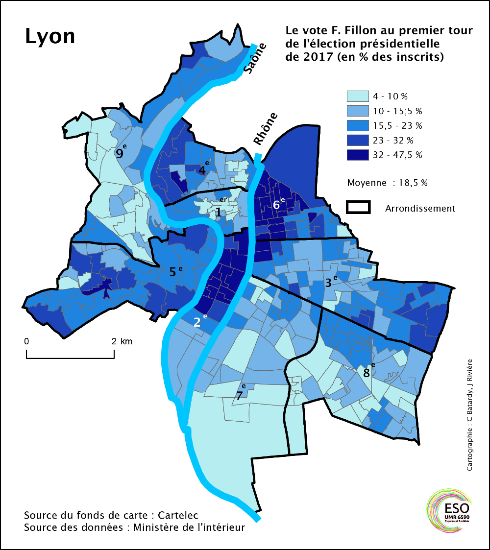 Le vote Fillon apparaît très concentré dans deux arrondissements : le 6e (33,3 % des voix des inscrits et 40,4 % des suffrages exprimés, soit 16 points de plus que la moyenne lyonnaise) et le 2e (30 % des inscrits et 36,2 % des exprimés, soit 13 points de plus), qui correspondent historiquement aux lieux de résidence de la bourgeoisie lyonnaise, avec une très nette surreprésentation dans la partie nord-ouest du 6e, entre le parc de la Tête d’Or et le Rhône, et dans le quartier très catholique d’Ainay dans le 2e (carte 2). Cette concentration très marquée est ainsi étroitement liée à la forte agrégation des catégories aisées dans l’espace urbain, à Lyon comme ailleurs (Oberti et Préteceille 2016). Les ressorts du vote filloniste renvoient, en effet, à la présence d’électeurs diplômés (r = 0,59 avec les bac + 3 et plus), de non-salariés de 15 ans ou plus, indépendants ou employeurs (0,72), d’artisans, de commerçants et de chefs d’entreprise (0,58), de cadres et professions intellectuelles supérieures (0,60), de catégories âgées (0,20 pour les 55‑64 ans ; 0,37 pour les 65‑79 ans et 0,40 pour les 80 ans et plus) et de propriétaires (0,43). Politiquement, les voix portées sur F. Fillon sont corrélées très fortement avec celles en 2012 en faveur de Nicolas Sarkozy (0,97) et, dans une moindre mesure, de François Bayrou (0,43). Aux côtés de ces deux bastions figurent deux autres îlots de fortes surreprésentations du candidat Les Républicains : autour du parc de la Cerisaie sur le plateau de la Croix-Rousse (4e arrondissement), dont la population et l’habitat sont proches de ceux du 6e, et dans les quartiers contigus du Point du Jour et de Champvert-Est (sur « la colline qui prie ») dans le 5e arrondissement. À l’inverse, le vote Fillon est très sous-représenté dans les quartiers populaires des 7e, 8e et 9e arrondissements et dans le 1er arrondissement (où il obtient son score le plus faible : 12,3 % des voix des inscrits, 15,1 % des suffrages exprimés).