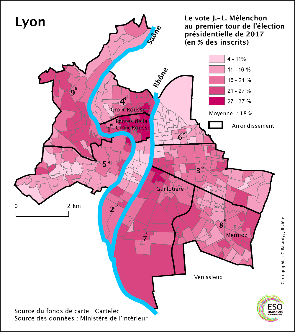 Le second électorat Mélenchon, d’autre part, est plus populaire. En termes de suffrages exprimés, la France insoumise fait une réelle percée – qu’il faut relativiser par le poids local de l’abstention (carte 6) – dans l’est de la ville où les ouvriers et les actifs les plus précaires sont particulièrement présents et où la part du logement social est forte. C’est notamment le cas dans le 8e arrondissement et en particulier les quartiers jouxtant la commune de Vénissieux, de tradition communiste, où Jean-Luc Mélenchon atteint 37,2 % des suffrages exprimés à Moulin à Vent et dépasse 40 % dans certains bureaux du quartier Mermoz. Dans ces quartiers, le score de Benoît Hamon est inférieur ou égal à sa moyenne sur la ville. Il est, par contre, surreprésenté dans certains quartiers où les professions intermédiaires occupent une part plus importante dans la population (comme le quartier Vaise–Industrie, dans le 9e) et où Jean-Luc Mélenchon ne dépasse que plus faiblement son score moyen.